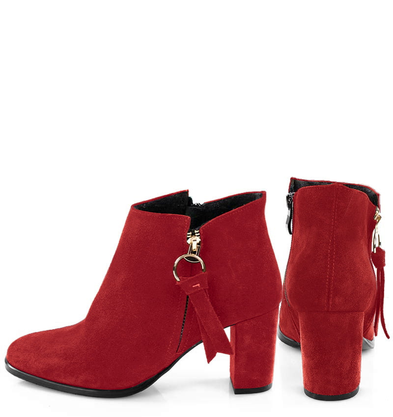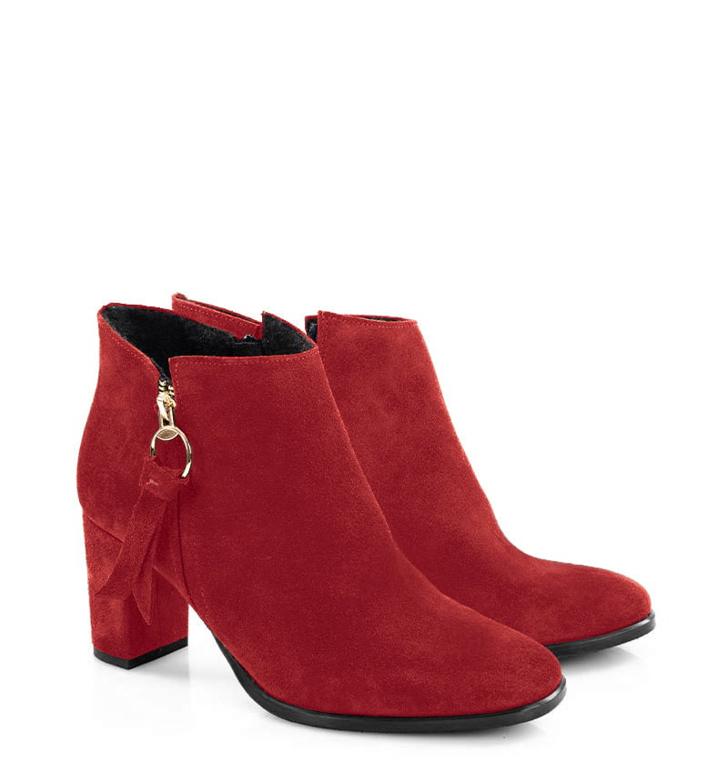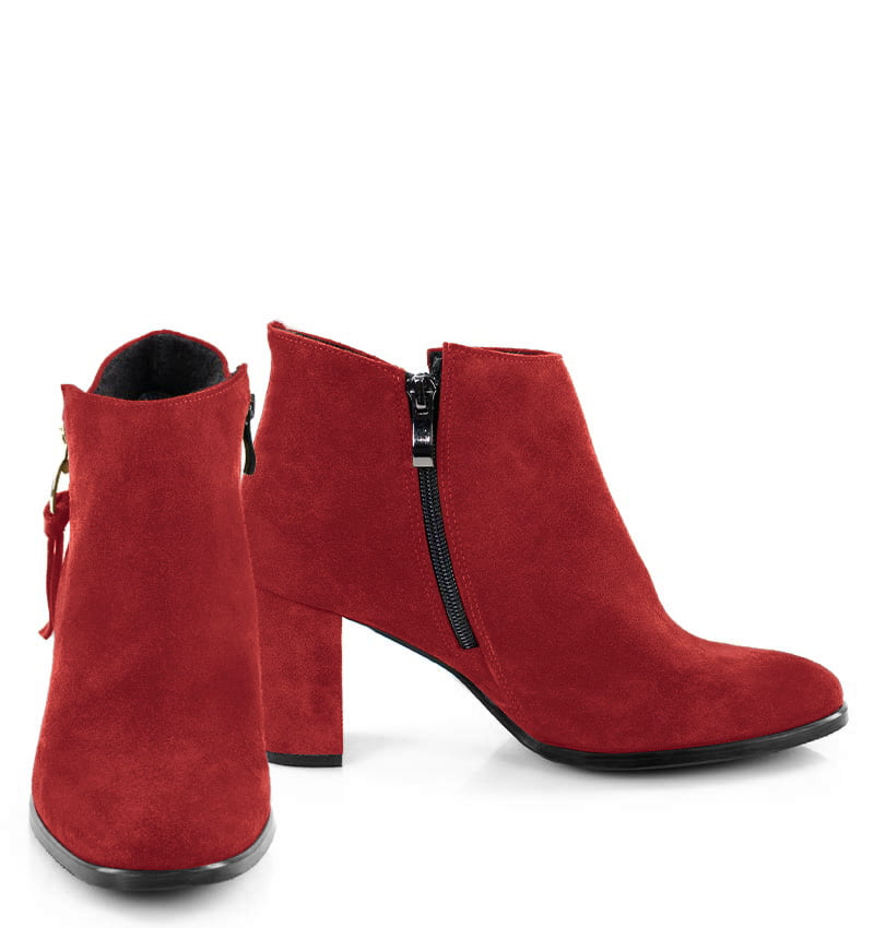 JUDITH – Czerwone botki do kostki, na 7,5 cm słupku. (wysokość obcasa jest mierzona w rozmiarze 37). Botki wykonane z zamszowej skóry naturalnej. Czubek w zaokrąglony. Średnia wysokość obcasa sprawia, że są to wygodne botki na słupku. Tęgość butów: G. Wnętrze butów jest lekko ocieplone cienkim kocem obuwniczym.