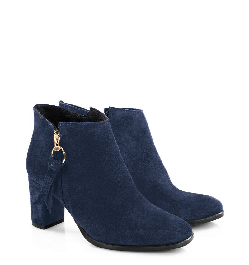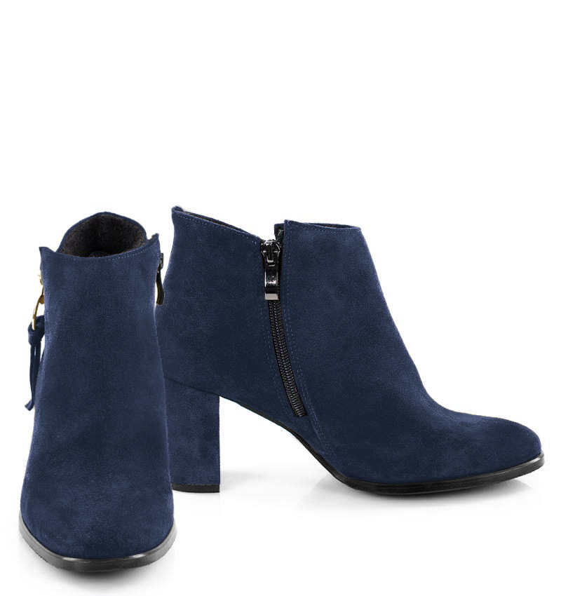 Granatowa skóra welurowa, ma doskonałe właściwości dopasowywania się do stopy. Botki są łatwe w utrzymaniu w czystości i konserwacji za pomocą środków do nubuku, weluru i zamszu.