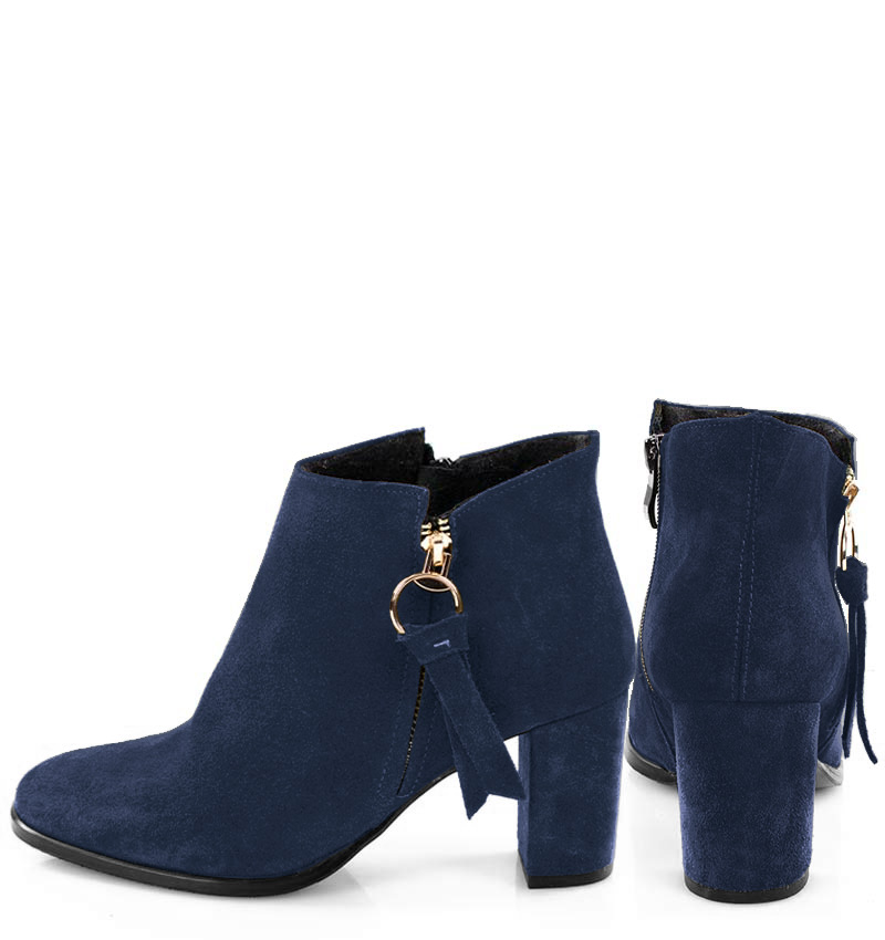 JUDITH – Granatowe botki do kostki, na 7,5 cm słupku. (wysokość obcasa jest mierzona w rozmiarze 37). Botki wykonane z welurowej skóry naturalnej. Czubek w zaokrąglony. Średnia wysokość obcasa sprawia, że są to wygodne botki na słupku. Tęgość butów: G. Wnętrze butów jest lekko ocieplone cienkim kocem obuwniczym.
