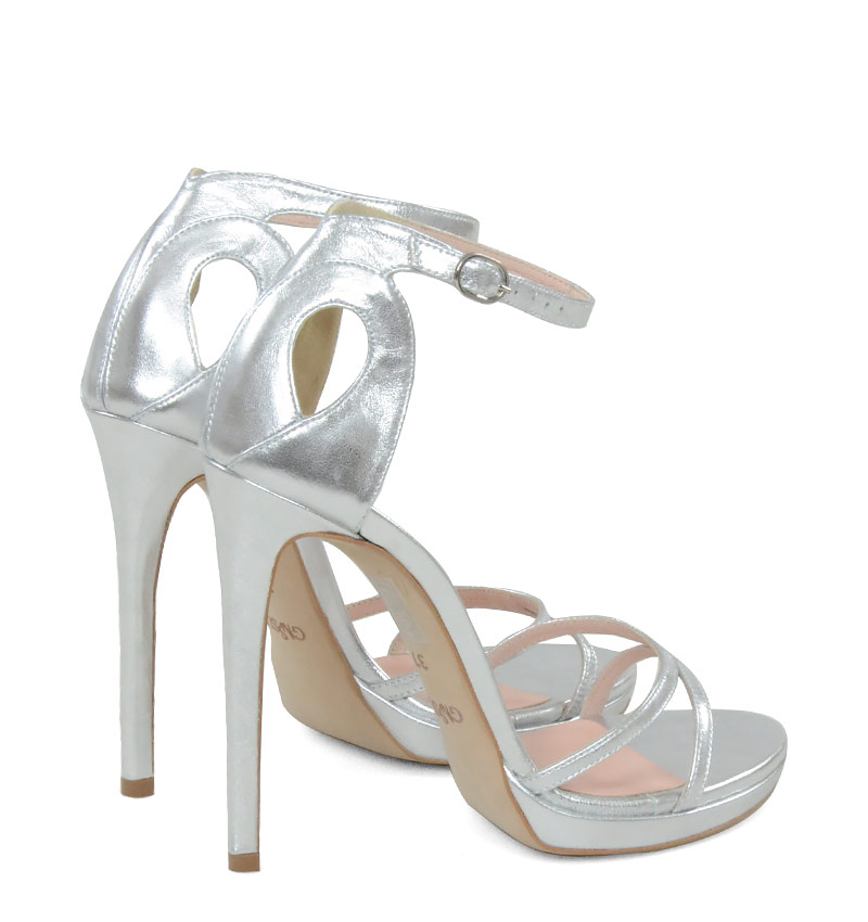 Srebrne sandałki na bardzo wysokim obcasie wykonywane są ręcznie, dzięki czemu istnieje możliwość indywidualnego dostosowania kolorów skór i wykończenia.