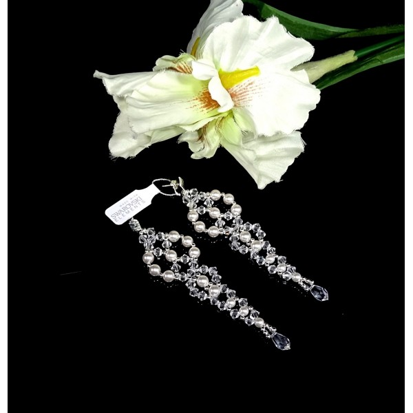 Kolczyki – bardzo lekkie, srebrne p. 925, wykonane z kryształów Precioso i białych perełek. Doskonały dodatek ślubny i wieczorowy.