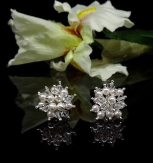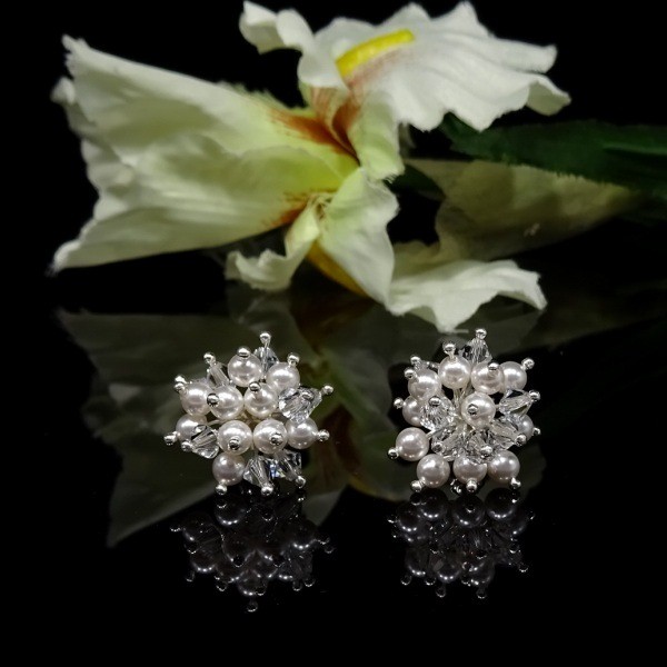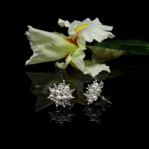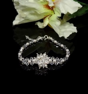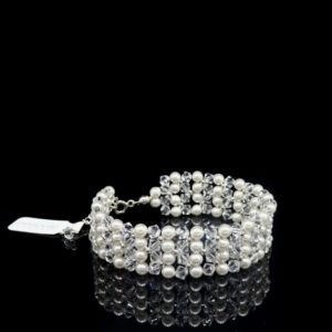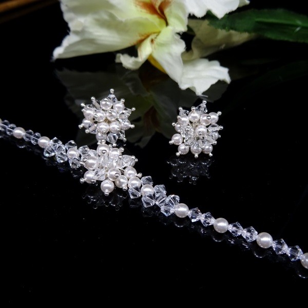 Komplet biżuterii ślubnej – Efektowne kolczyki na sztyfcie wraz z bransoletką stanowią niepowtarzalny zestaw. Wykonane z kryształów crystal i białych pereł oraz srebra pr. 925.