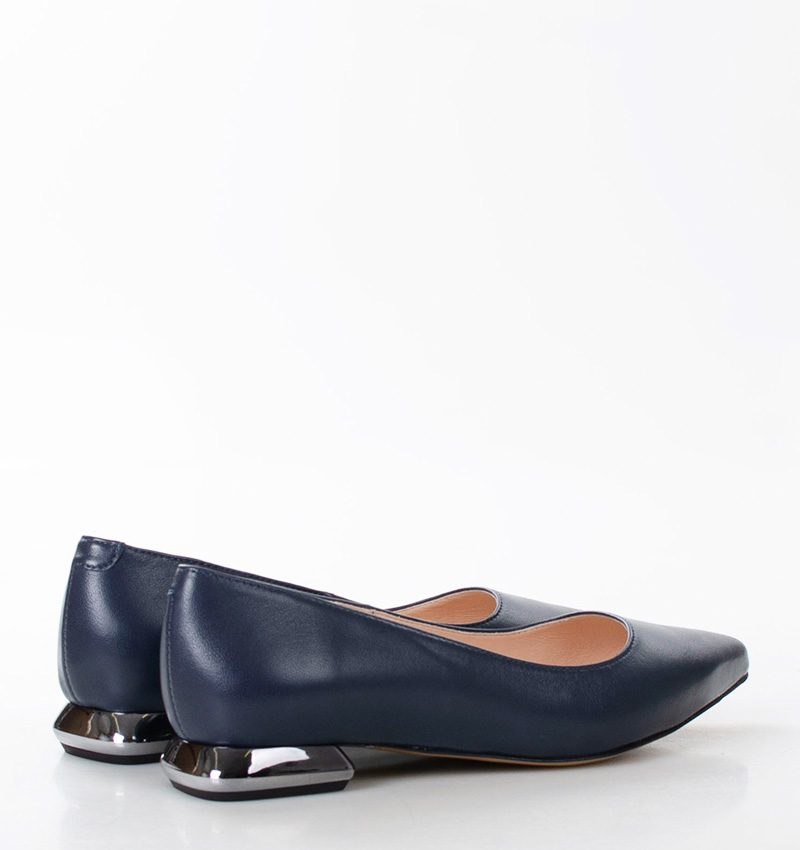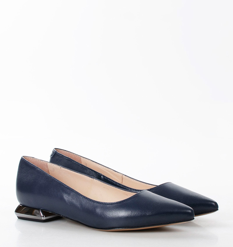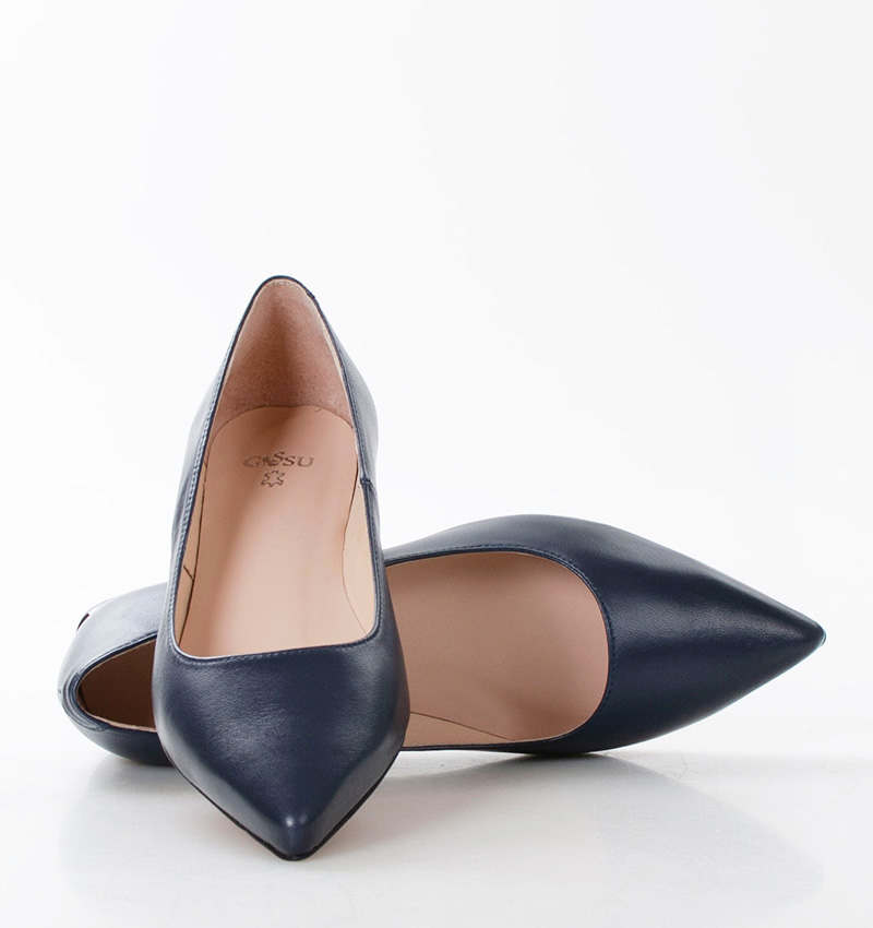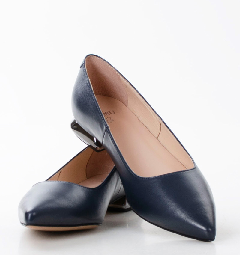 Baleriny KORA w odcieniu głębokiego granatu. Posiadają szpiczasty przód i dekoracyjny obcas. Wykonane z licowej skóry naturalnej, która dopasowuje się do kształtu stopy. Niewysoki, 2,5 cm obcas gwarantuje wyjątkową wygodę noszenia. Szerokość obuwia: F 1/2. Wewnętrzna część oraz wkładka butów wykonane są z naturalnej skóry.