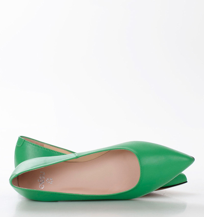 KORA zielone baleriny. Czubek klasyczny w szpic, bez ozdób. Buty wykonane z naturalnej skóry licowej, układającej się do stopy. Płaski 2,5 cm obcas sprawia, że są to bardzo wygodne baleriny. Tęgość butów: F 1/2. Wnętrze butów i wkładka wykonane są ze skóry naturalnej.