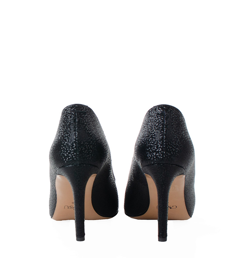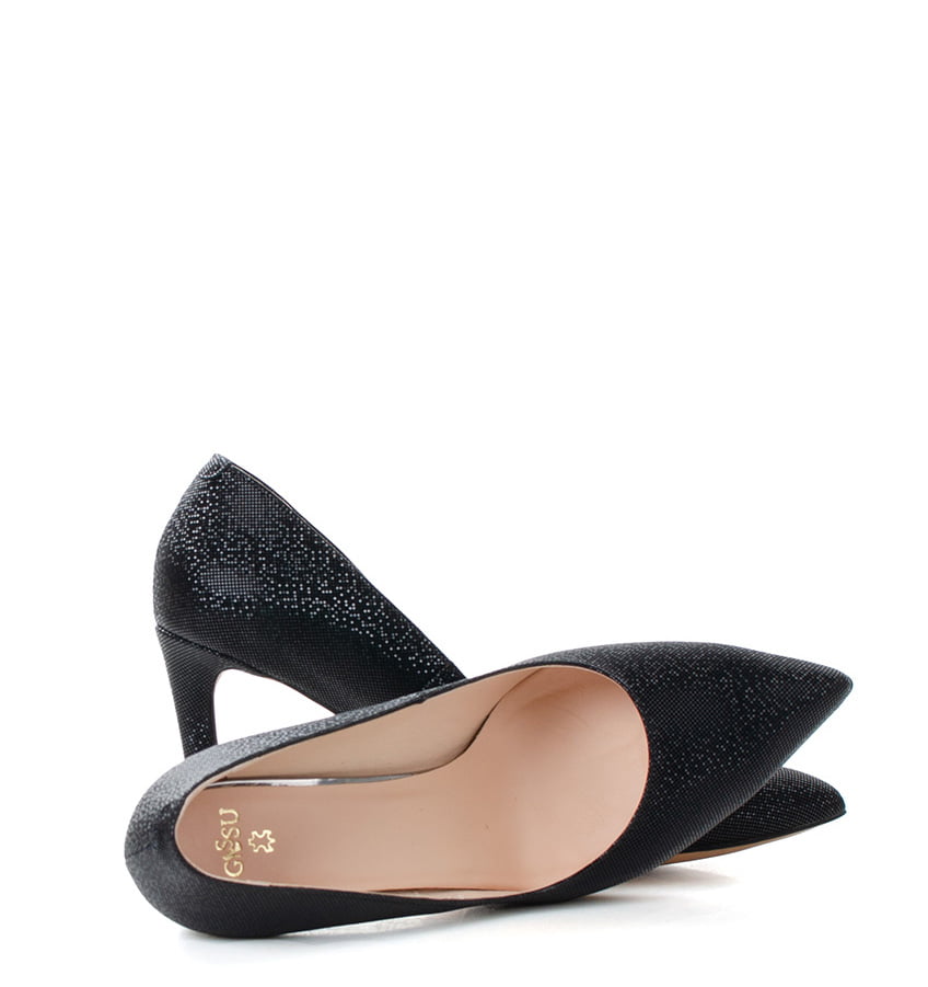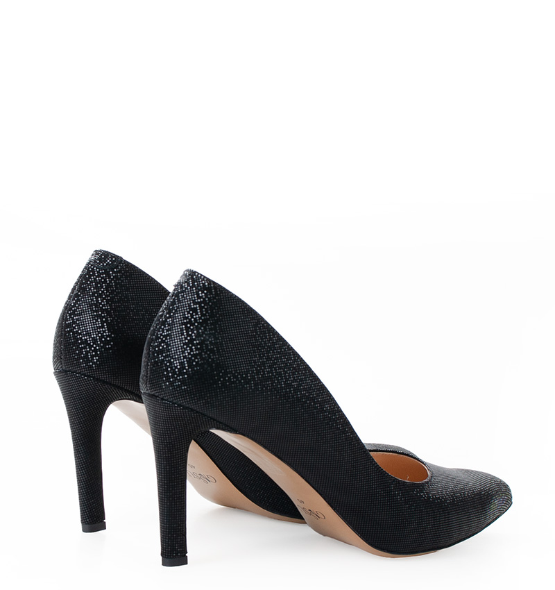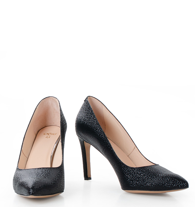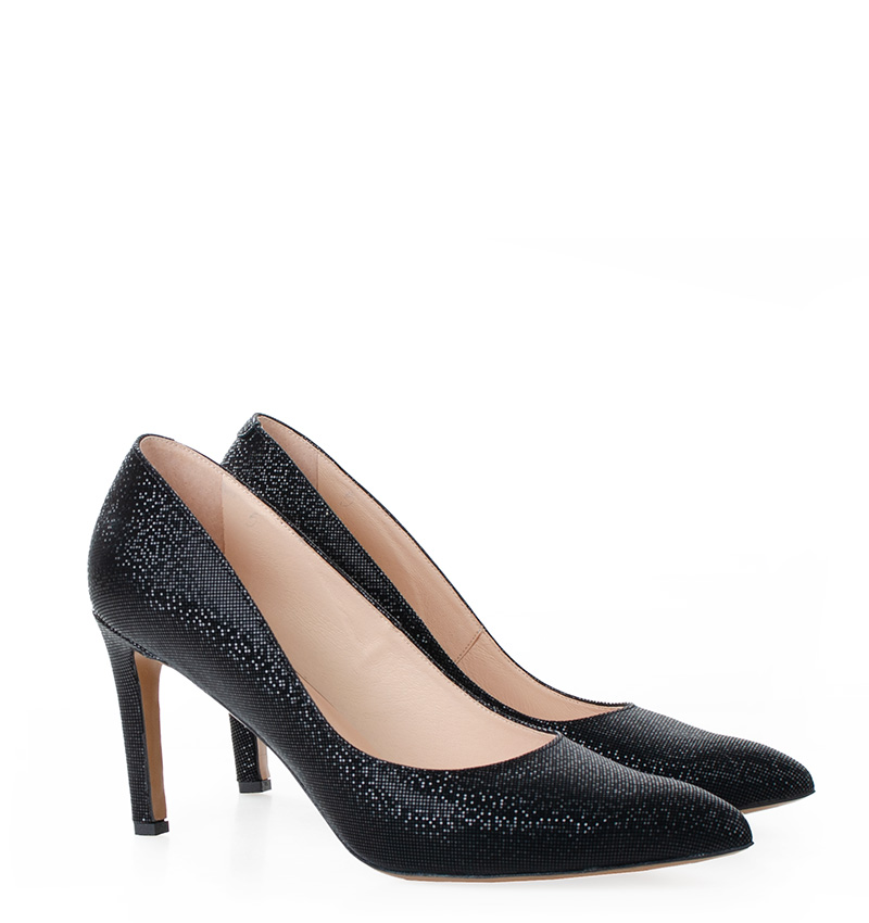 LENA – Czarne szpilki na 9,5 cm obcasie (wysokość obcasa jest mierzona w rozmiarze 37). Czubek w szpic. Buty wykonane z naturalnej skóry o delikatnym błysku. Tęgość butów: F 1/2. Wnętrze butów i wkładka wykonane są ze skóry naturalnej.