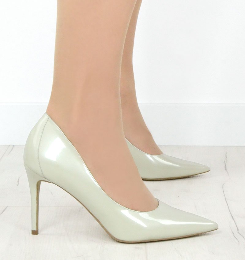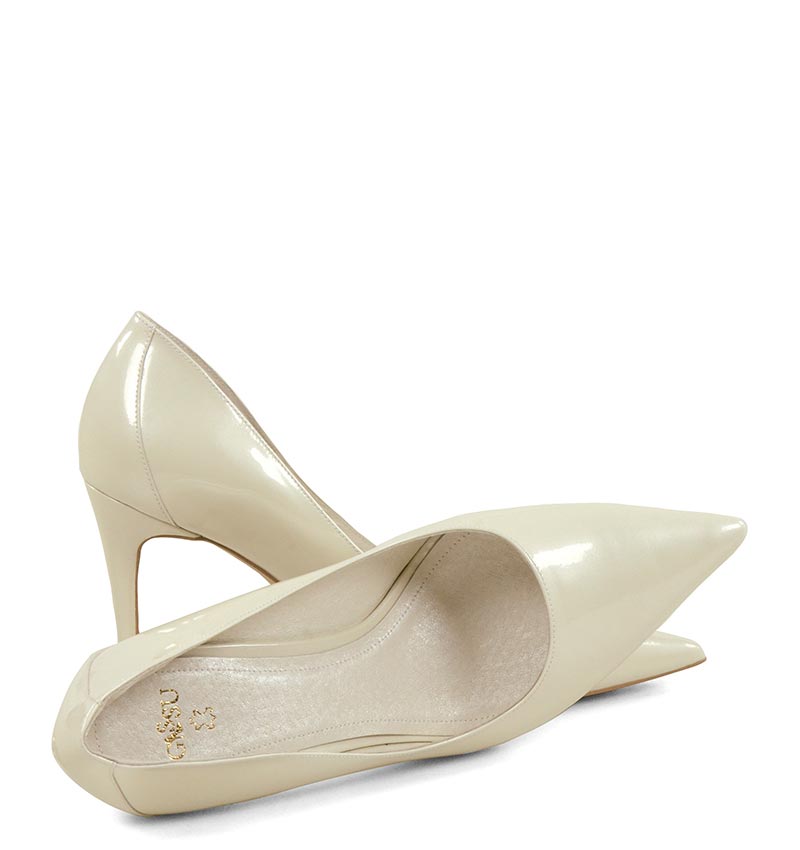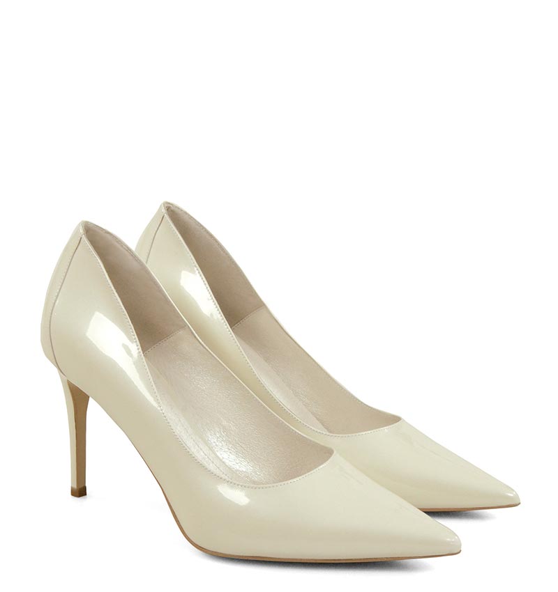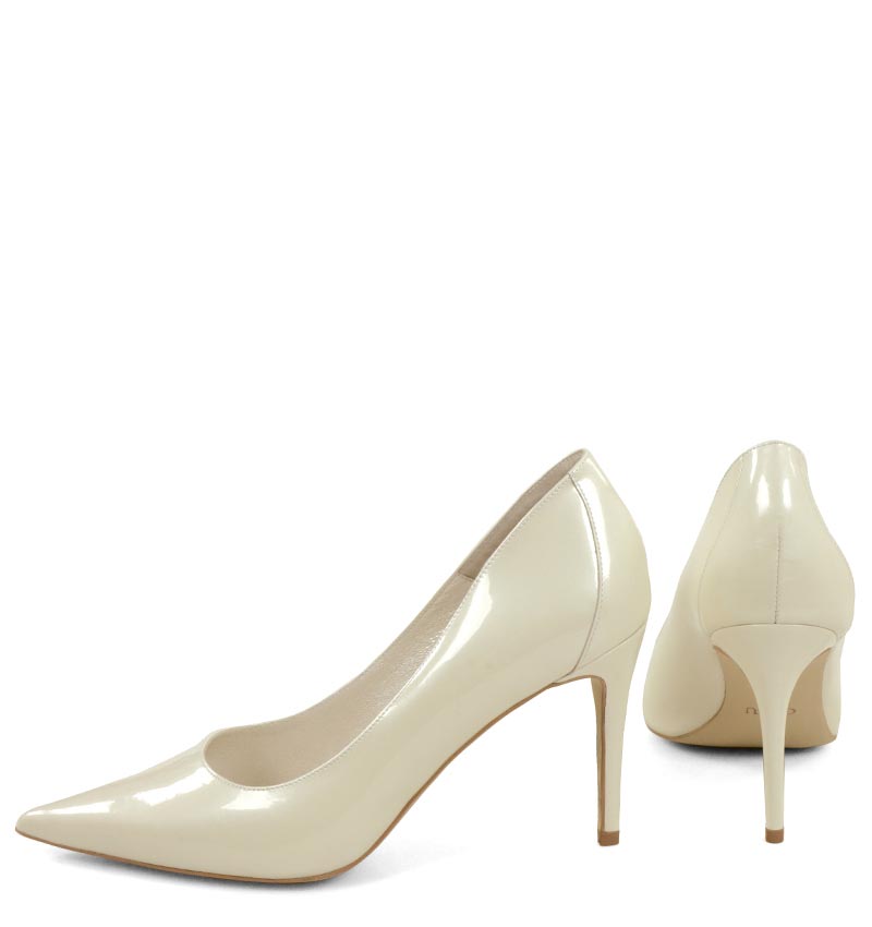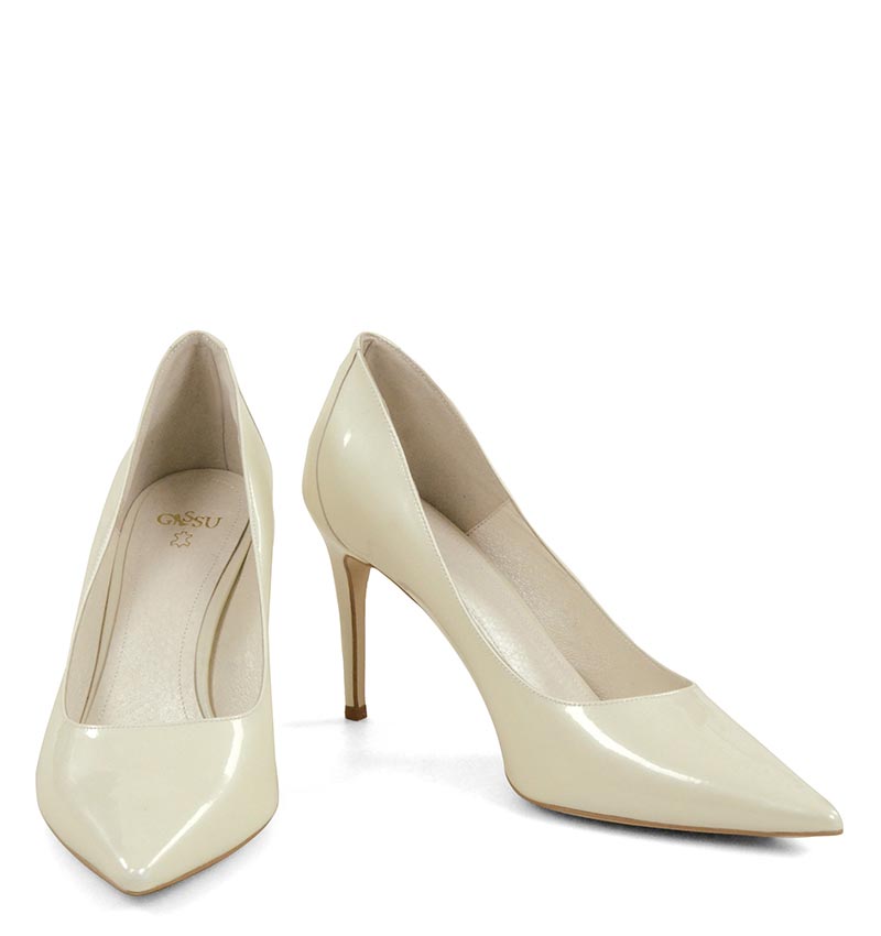 LILY – Ecru perła szpilki z perłowej skóry. Przód klasyczny gładki w szpic, pięta z ozdobnym przeszyciem na łączeniu skóry. Wysokiej wysokości cienka szpilka wysmukla sylwetkę buta. Wysokość obcasa 9 cm jest mierzona w rozmiarze 37. Buty wykonane w wysoko gatunkowej skóry naturalnej. Wnętrze, dla podniesienia komfortu noszenia produkowanych przez siebie butów Gassu, wykańcza delikatną kozią skórą. Tęgość butów: F1/2