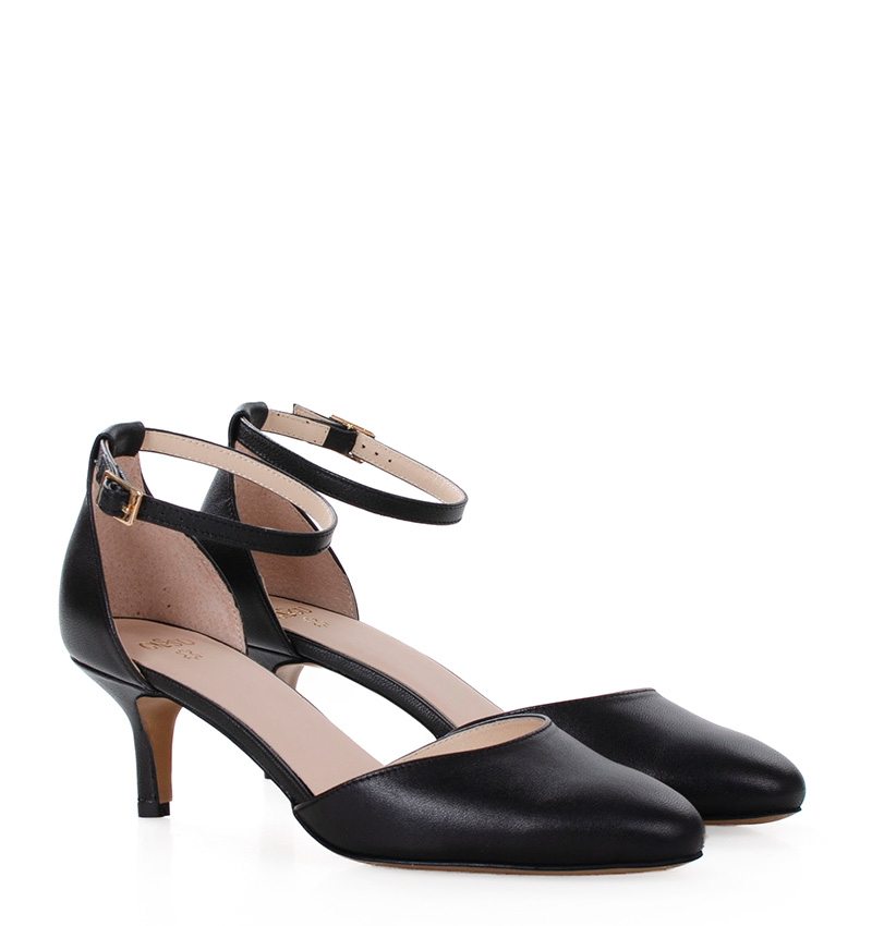Linda – Czarne szpilki na 5,5 cm obcasie (wysokość obcasa jest mierzona w rozmiarze 37). Nad kostką cienki pasek oplatający nogę, zapinane na klamerkę. Buty wykonane z naturalnej skóry licowej układającej się do stopy. Cholewka odkryta. Tęgość butów: F 1/2. Wnętrze szpilek wykończone delikatną skórą naturalną.