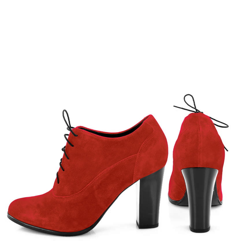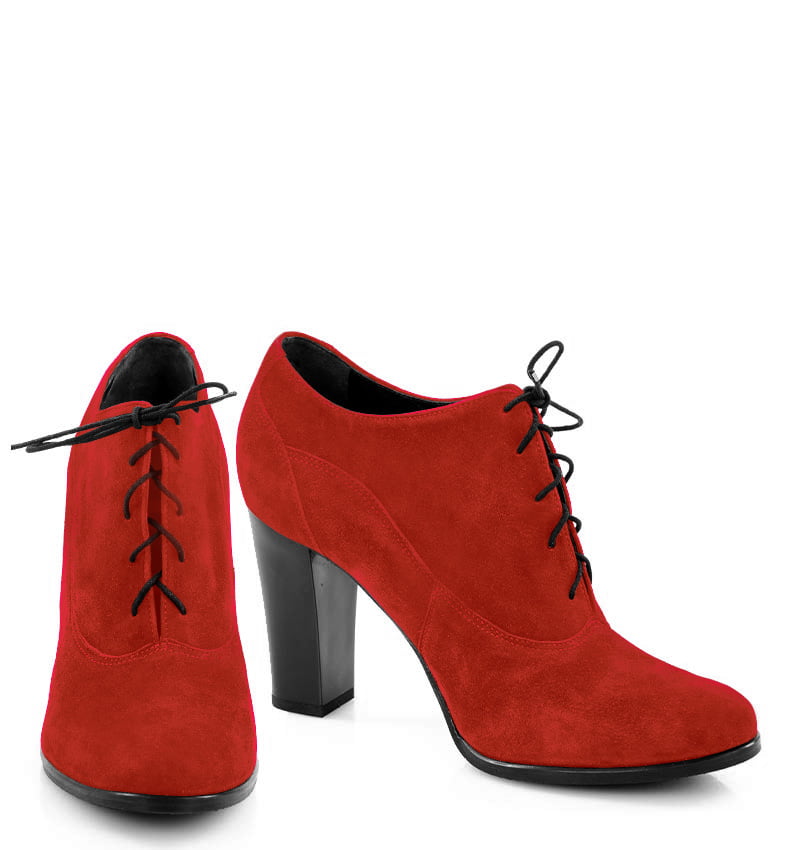 LIZZY – Jasno czerwone botki na 9,5 cm słupku (wysokość obcasa jest mierzona w rozmiarze 37). Czubek migdałowy, cholewka sznurowana. Buty wykonane z naturalnej skóry zamszowej układającej się do stopy. Tęgość butów: F 1/2. Wnętrze butów wykończone skórą naturalną, botki nieocieplone.