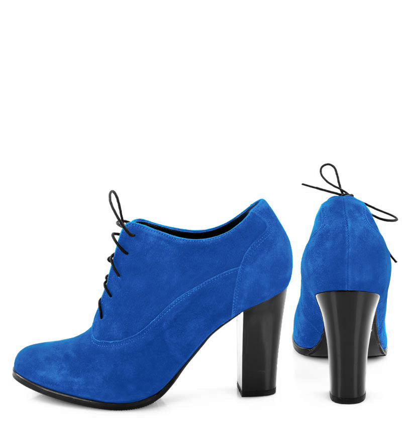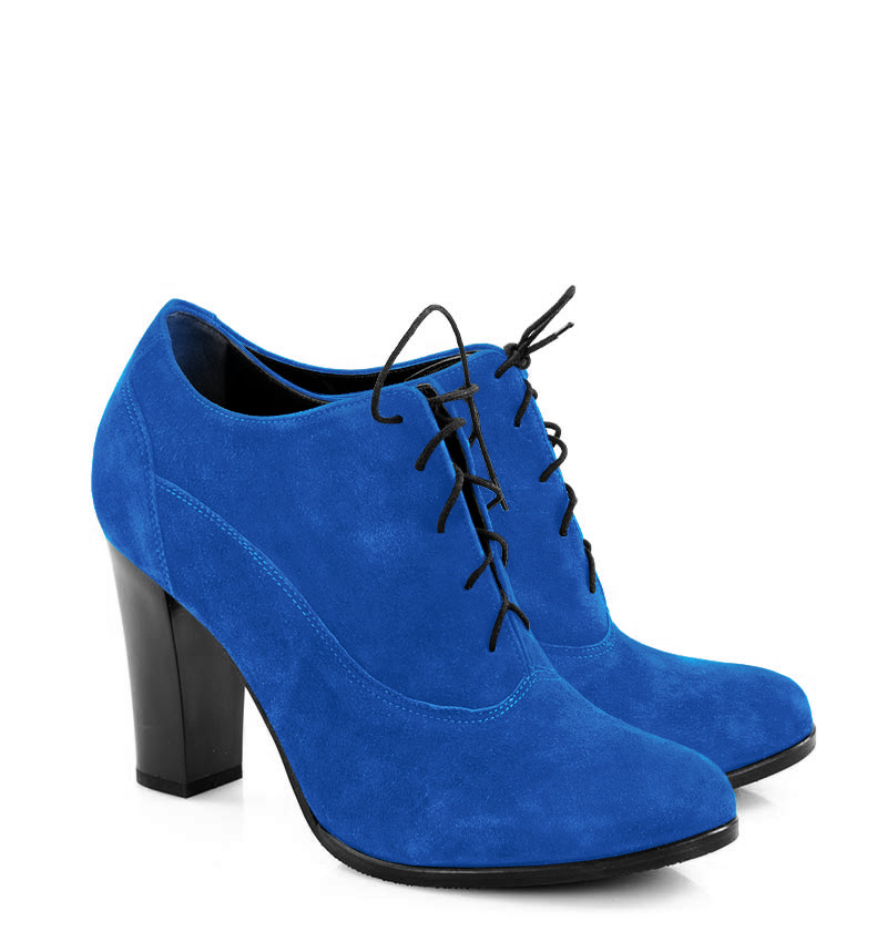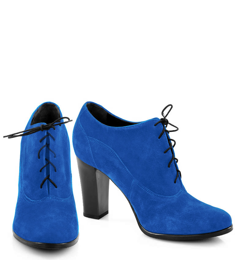 LIZZY – Niebieskie botki na 9,5 cm słupku (wysokość obcasa jest mierzona w rozmiarze 37). Czubek migdałowy, cholewka sznurowana. Buty wykonane z naturalnej skóry zamszowej układającej się do stopy. Tęgość butów: F 1/2. Wnętrze butów wykończone skórą naturalną, botki nieocieplone.