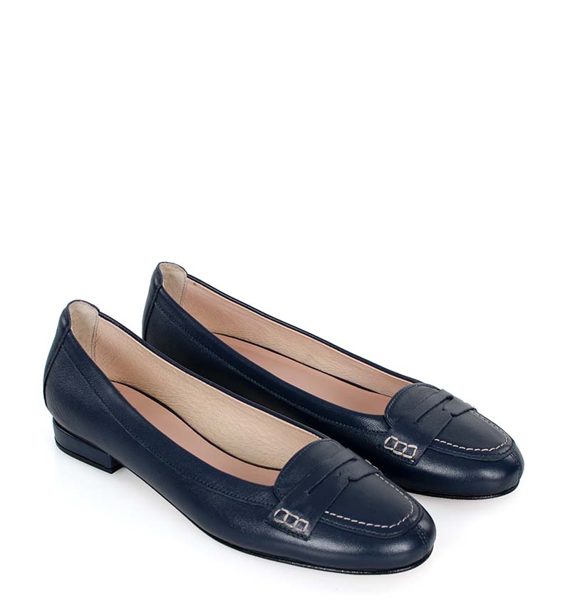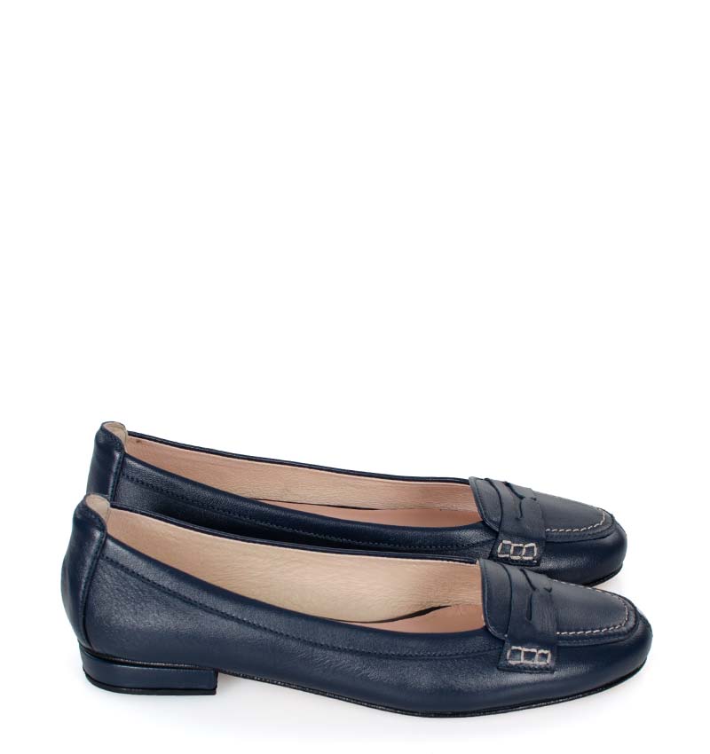 Granatowe mokasyny na niskim obcasie wykonywane są ręcznie, dzięki czemu istnieje możliwość indywidualnego dostosowania i personalizacji butów
