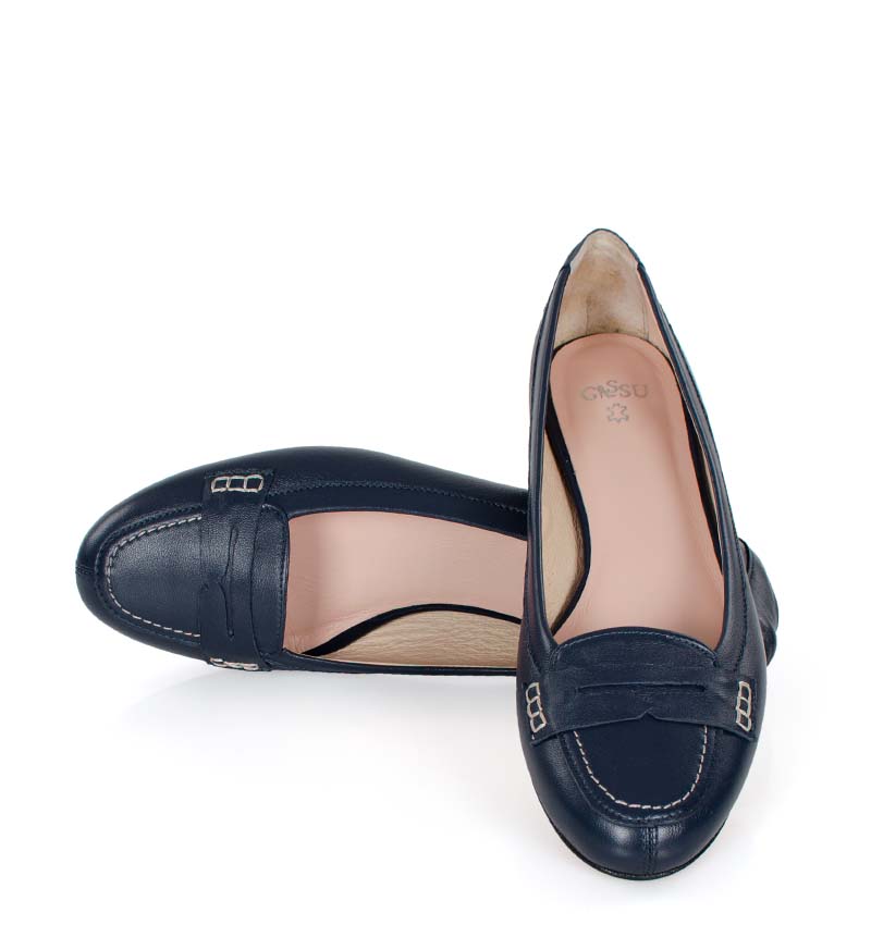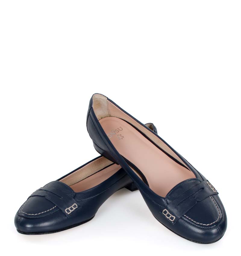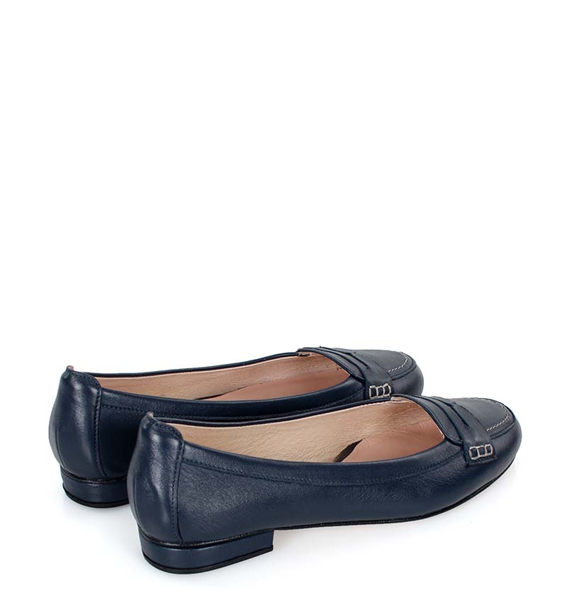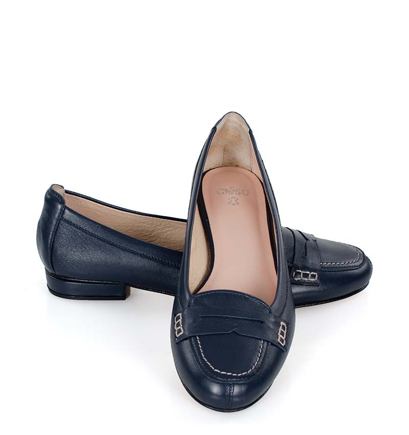 LORA – Granatowe mokasyny wykonane z licowej skóry naturalnej. Obcas 1 cm, czubek okrągły, wnętrze i wkładka wykonane z delikatnej skóry naturalnej. Wygodne baleriny w stylu mokasynów. Tęgość butów to F 1/2.