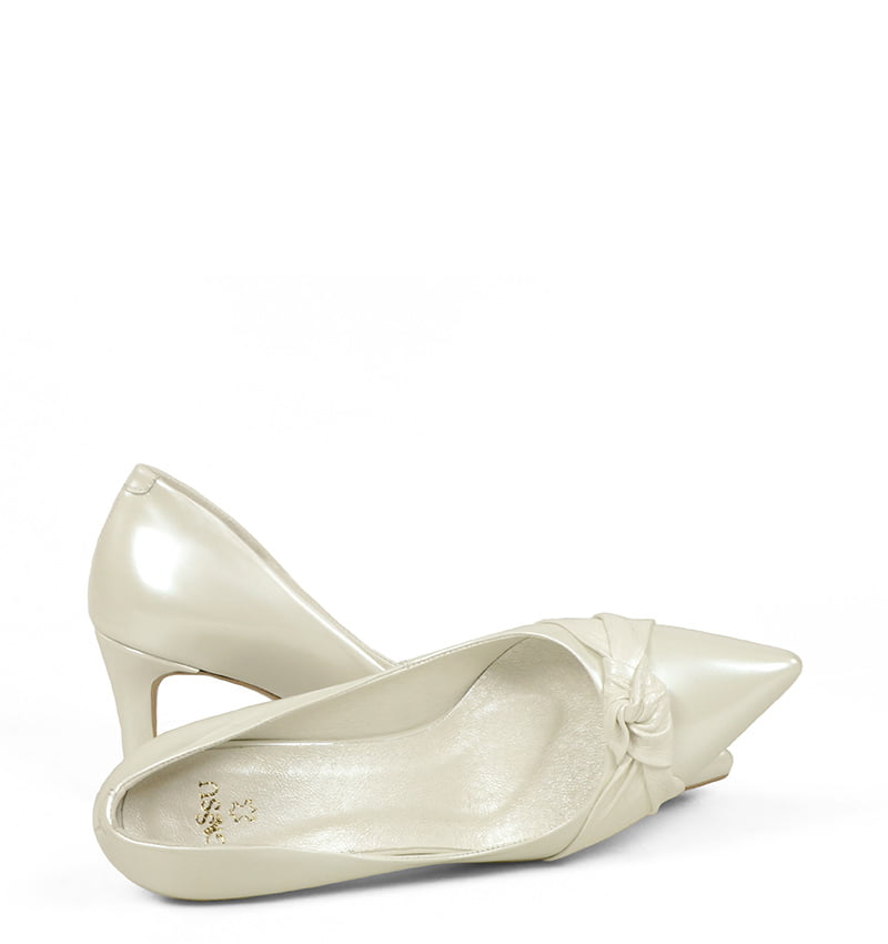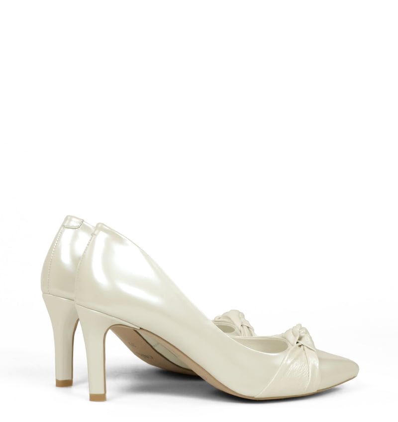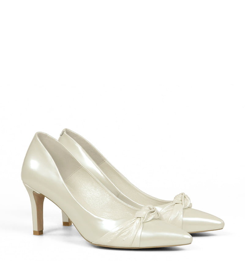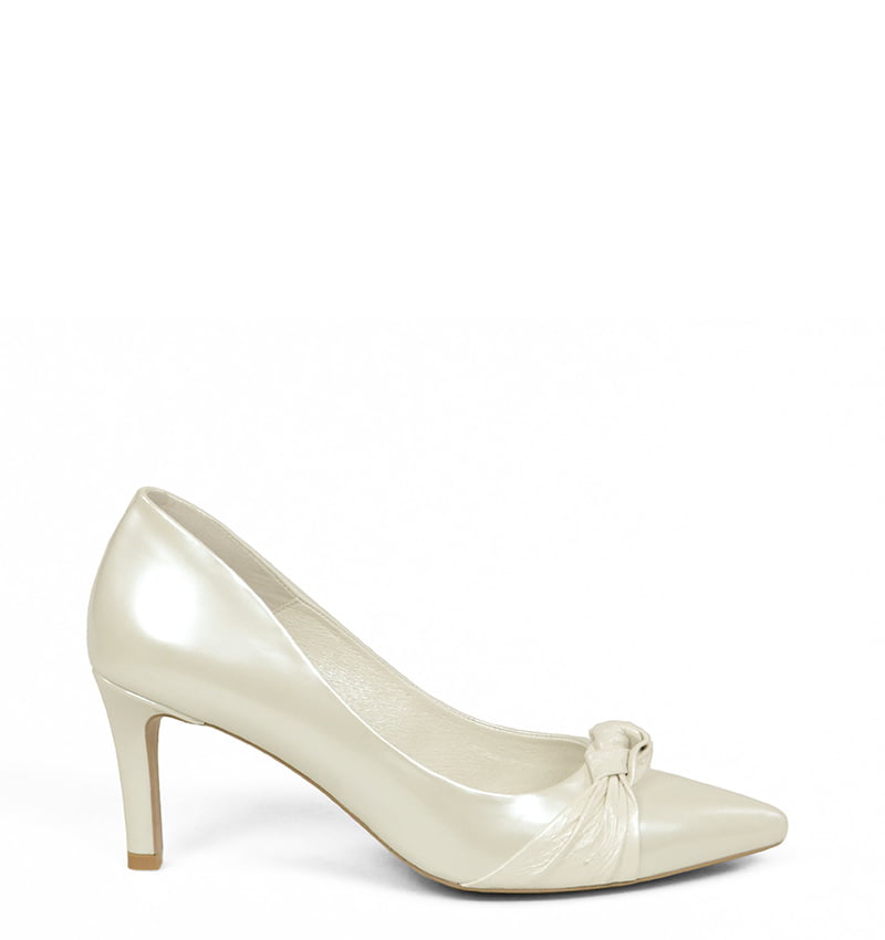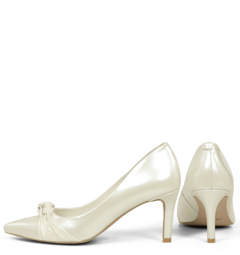 LOTE – Ecru średnie szpilki na 7,5 cm obcasie (wysokość obcasa jest mierzona w rozmiarze 37). Czubek w szpic, dodatkowo uroku dodaje ozdobione przewiązanie na czubku. Są to idealne buty ślubne. Buty wykonane z naturalnej skóry układającej się do stopy. Średnia wysokość obcasa sprawia, że są to wygodne szpilki. Tęgość butów: F 1/2. Wnętrze butów wykończone delikatną skórą naturalną.