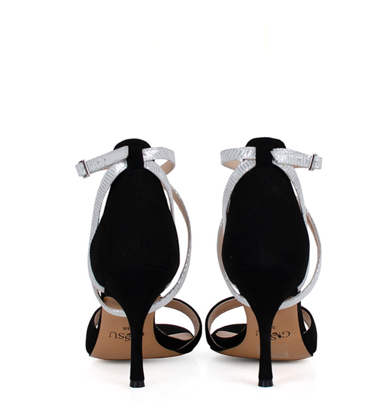 LOUISA – Czarne sandały na szpilce ze srebrnymi paskami