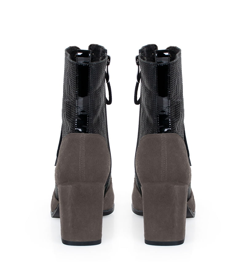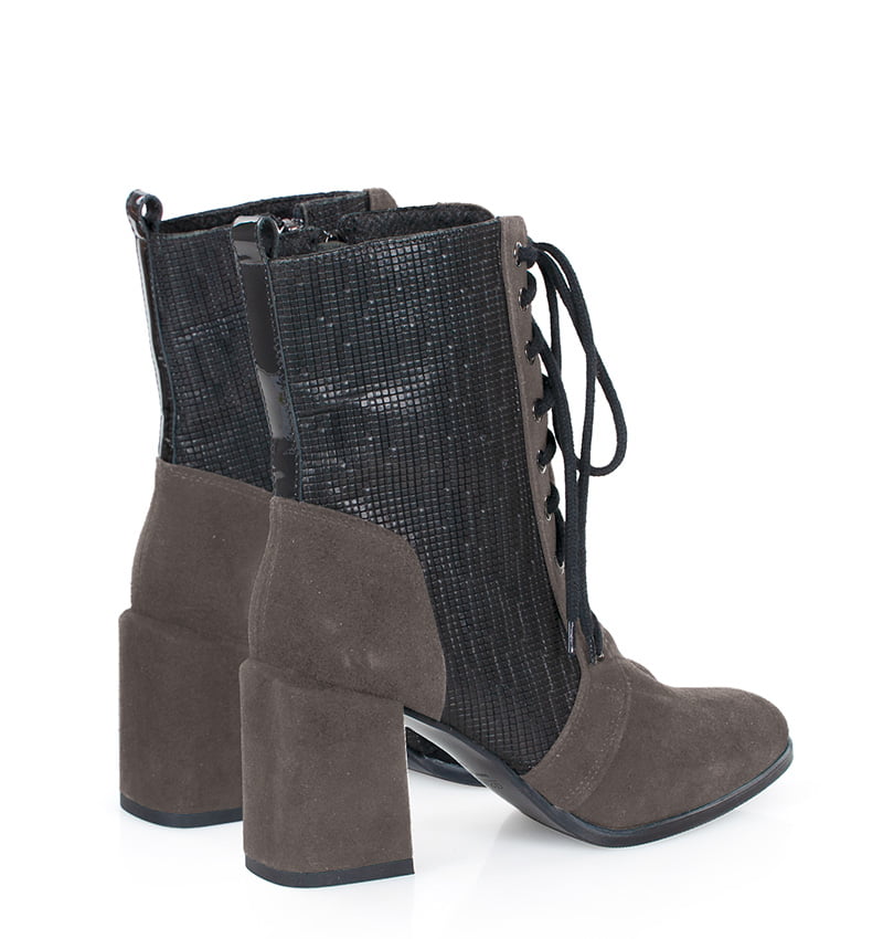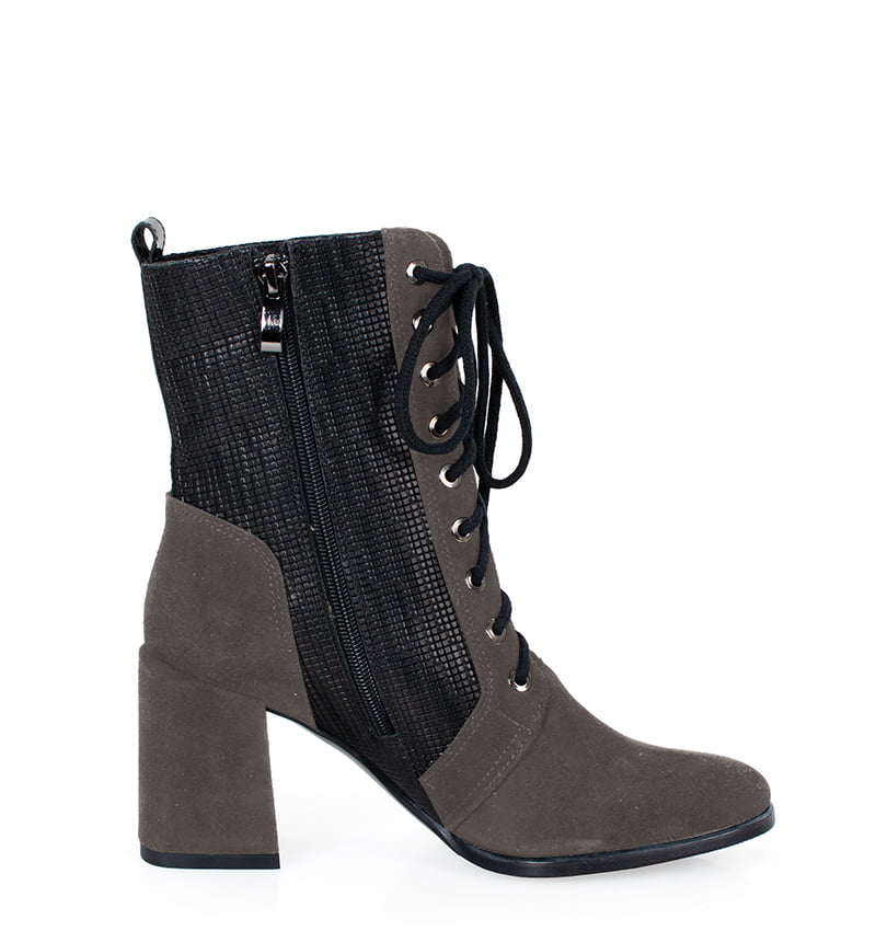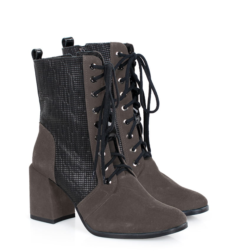 MADISON – Ciemno szare botki na 8 cm grubym słupku (wysokość obcasa jest mierzona w rozmiarze 37). Cholewka wykonana z dwóch rodzajów skór naturalnych, strukturalnej i welurowej. Botki są sznurowane i dodatkowo zapinane na zamek. Buty wykonane w tęgości: F 1/2. Wnętrze butów jest ocieplone cienkim kocem obuwniczym.