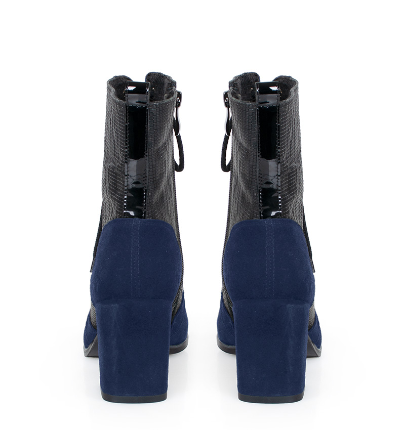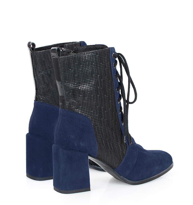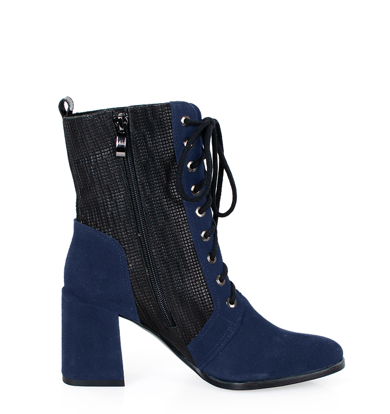 MADISON – Granatowe botki na 8 cm grubym słupku (wysokość obcasa jest mierzona w rozmiarze 37). Cholewka wykonana z dwóch rodzajów skór naturalnych, strukturalnej i welurowej. Botki są sznurowane i dodatkowo zapinane na zamek. Buty wykonane w tęgości: F 1/2. Wnętrze butów jest ocieplone cienkim kocem obuwniczym.