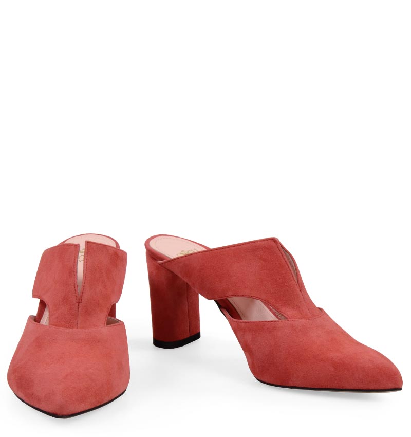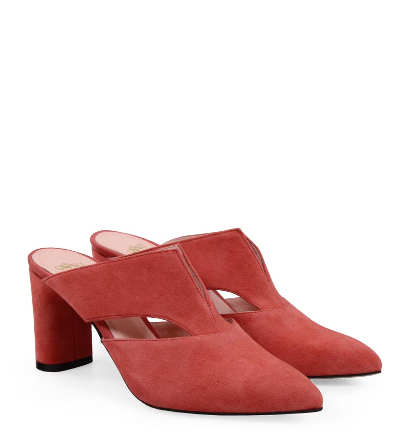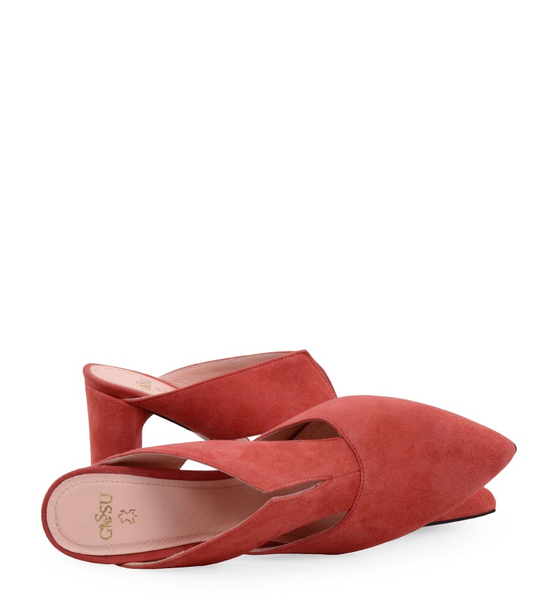 MAGGIE – Czerwone klapki na 7,5 cm słupku (wysokość obcasa jest mierzona w rozmiarze 37). Czubek w szpic, wsuwane. Buty wykonane z naturalnej skóry zamszowej układającej się do stopy. Średnia wysokość obcasa sprawia, że są to wygodne klapki na lato. Tęgość butów: F. Wnętrze klapek wykończone skórą naturalną. Klapki na bardzo szczupłe stopy.