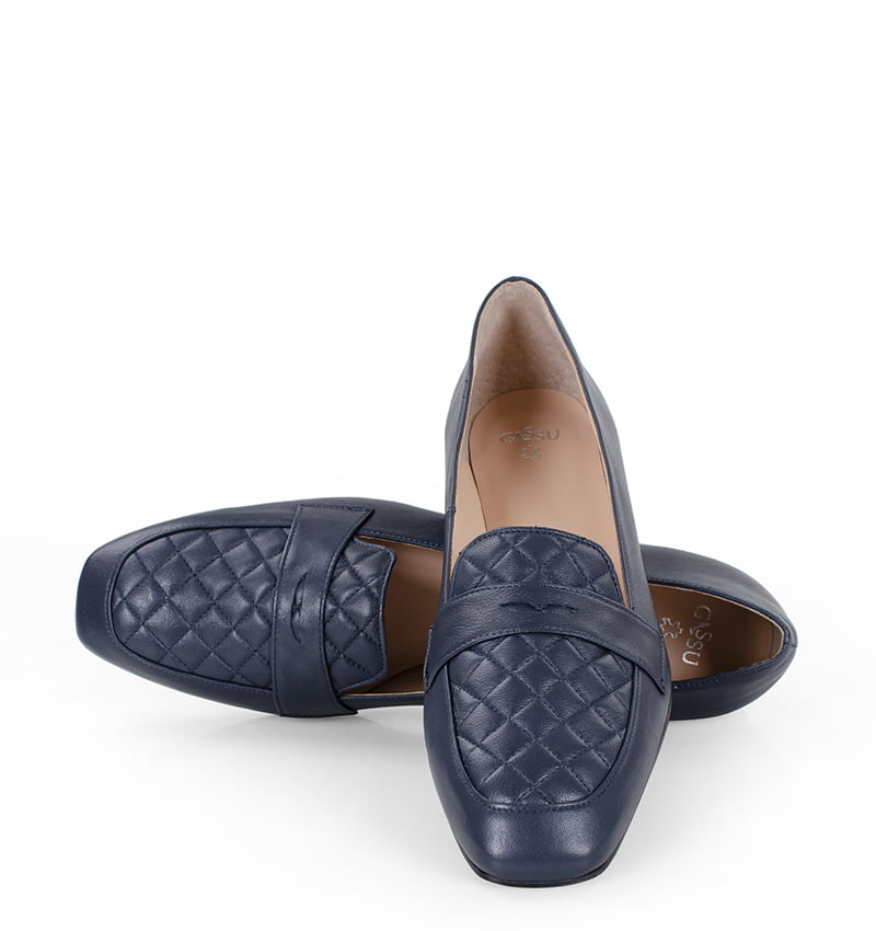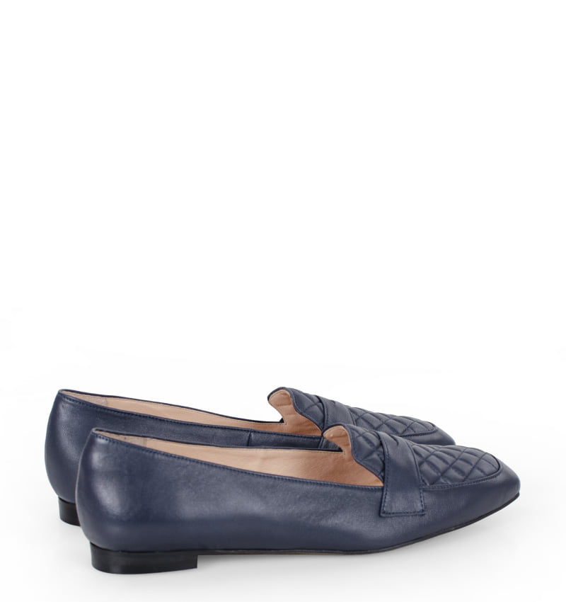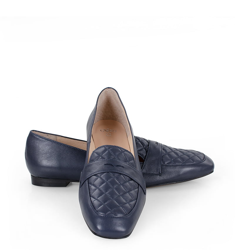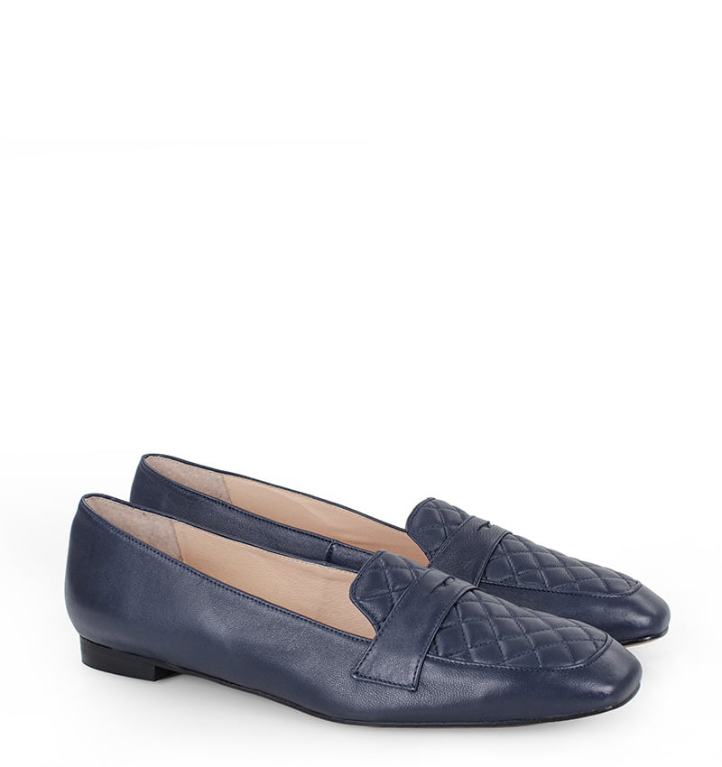 MARSHA – Granatowe mokasyny wykonane z licowej skóry naturalnej przeszytej w kratę. Obcas 1 cm, czubek lekko kwadratowy, wnętrze i wkładka wykonane z delikatnej skóry naturalnej. Wygodne baleriny w stylu mokasynów. Tęgość butów – F1/2.