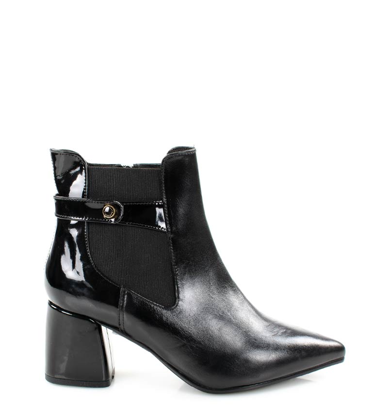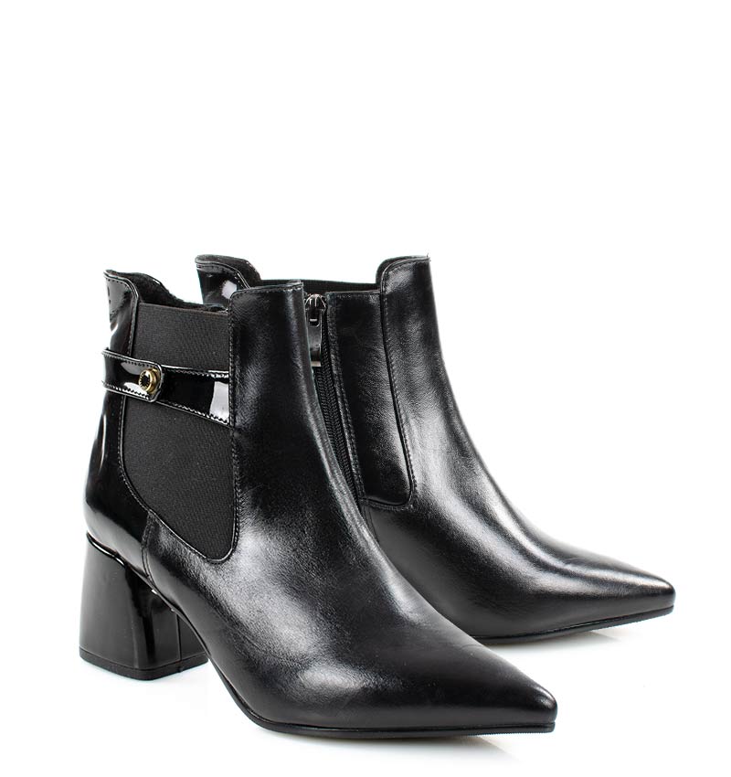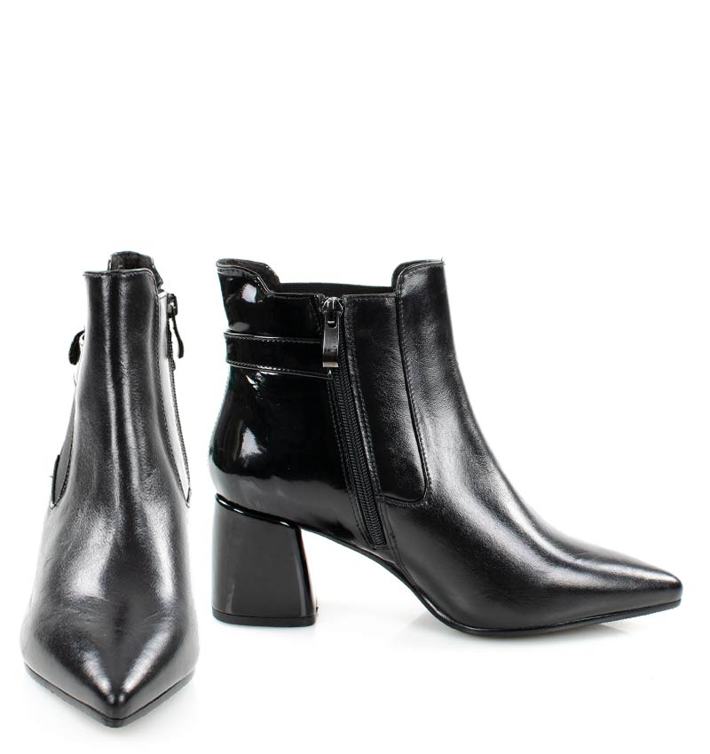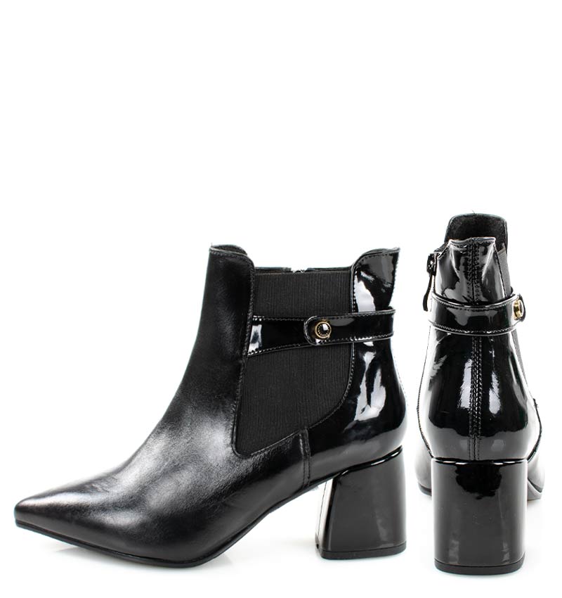 MARTHA – Czarne botki na 6,5 cm słupku (wysokość obcasa jest mierzona w rozmiarze 37). Czubek w szpic, zapinane na zamek . Buty wykonane z dwóch rodzajów skór naturalnych. Licowej i lakierowanej. Średnia wysokość obcasa sprawia, że są to wygodne botki. Tęgość butów: G. Wnętrze butów ocieplone cienkim kocem obuwniczym.