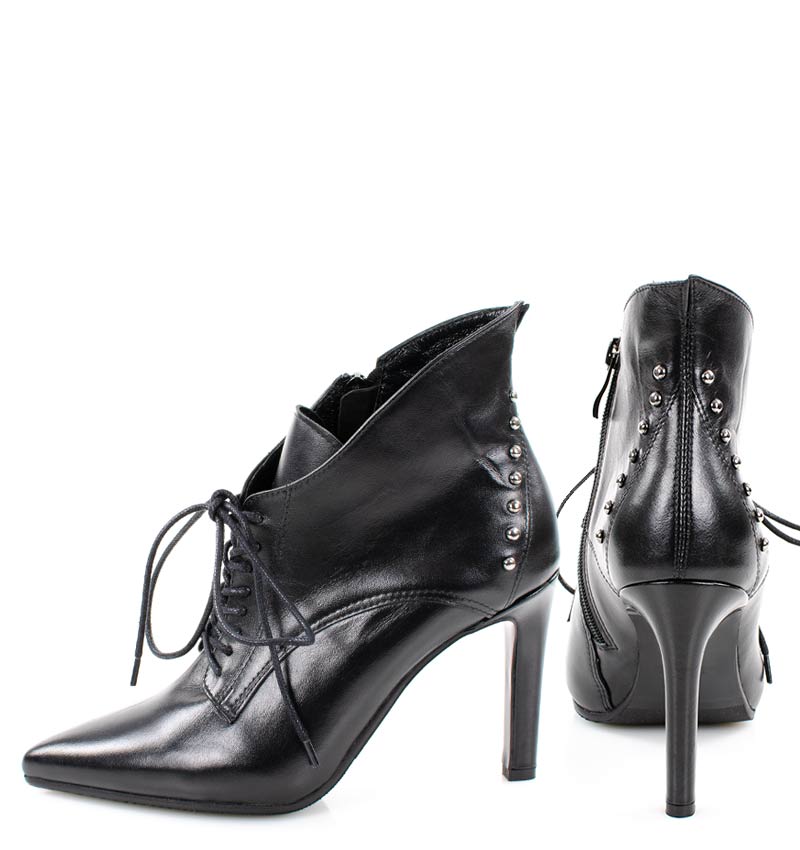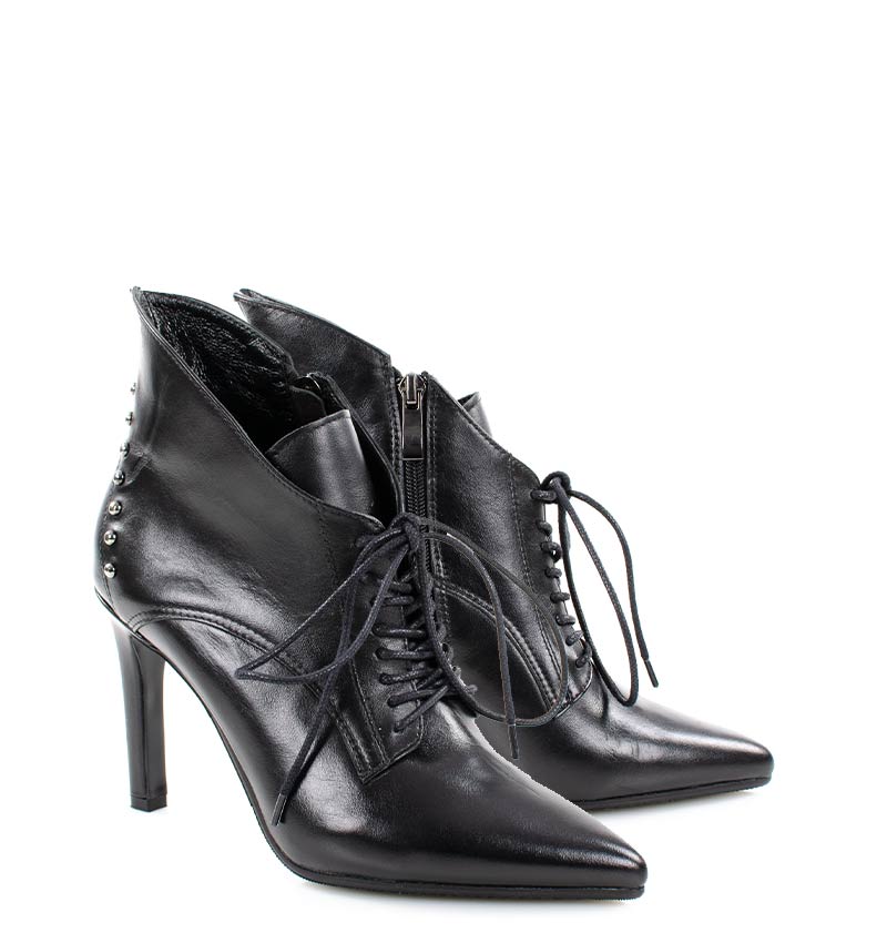 MARY – Czarne botki na 9,5 cm szpilce (wysokość obcasa jest mierzona w rozmiarze 37). Czubek w szpic, zapinane na zamek + ozdobne sznurowanie. Buty wykonane z naturalnej skóry licowej układającej się do stopy. Tęgość butów: F 1/2. Wnętrze butów wykończone skórą naturalną. Botki nieocieplone.