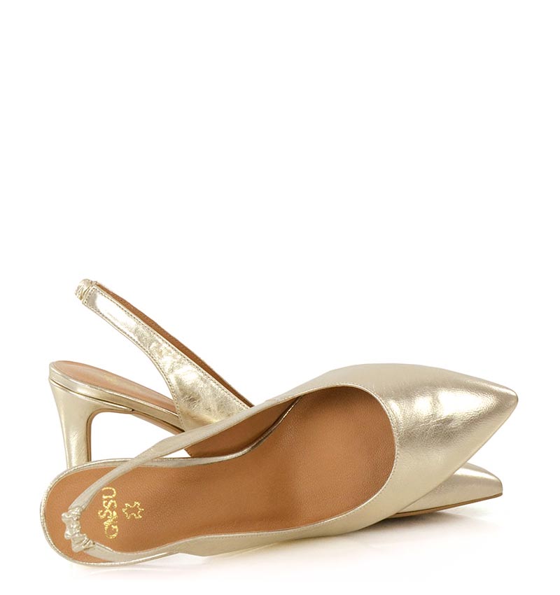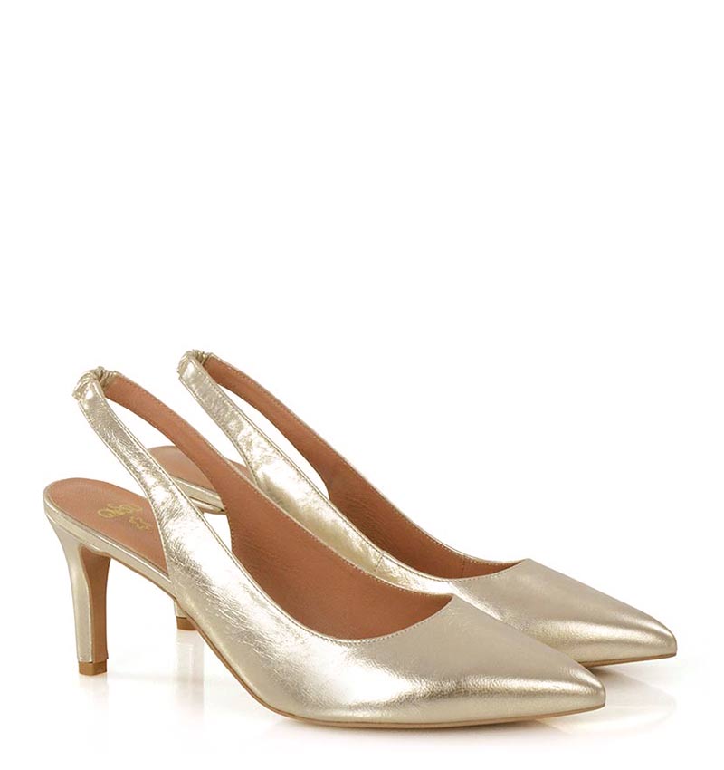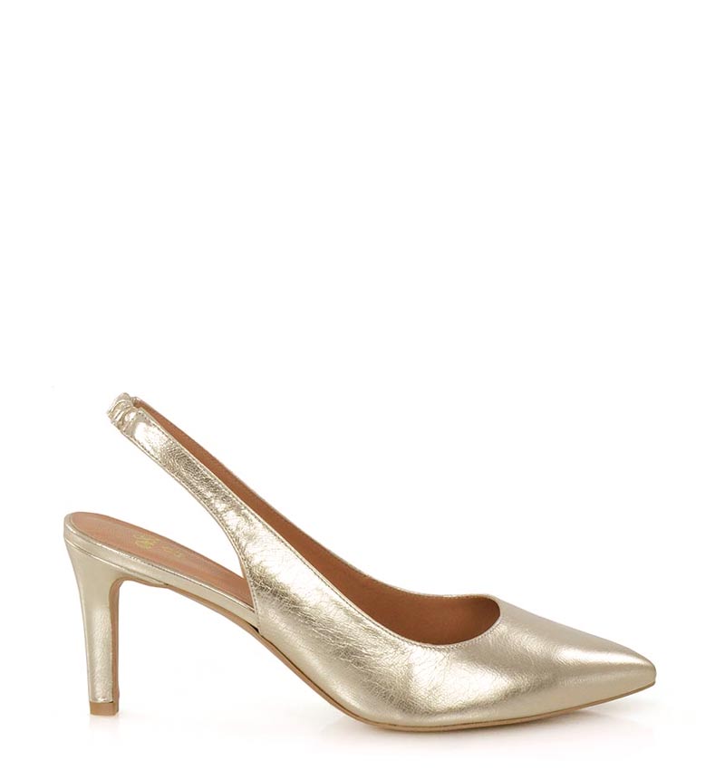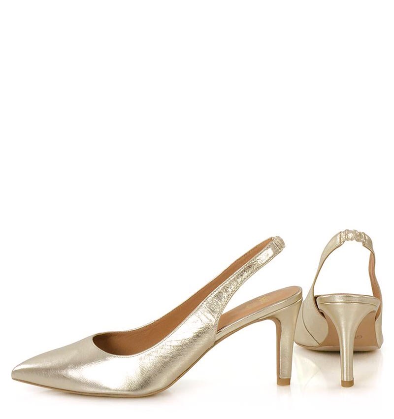 MAYA –  Złote szpilki z odkryta piętą na 8 cm szpilce (wysokość obcasa jest mierzona w rozmiarze 37). Czubek w szpic, paseczek z gumką na pięcie . Buty wykonane z naturalnej skóry licowej układającej się do stopy. Tęgość butów: F 1/2. Wnętrze szpilek wykończone skórą naturalną.