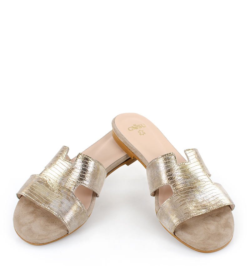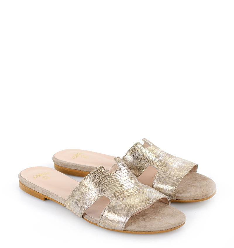 MELANIE – Złote klapki na płaskim obcasie