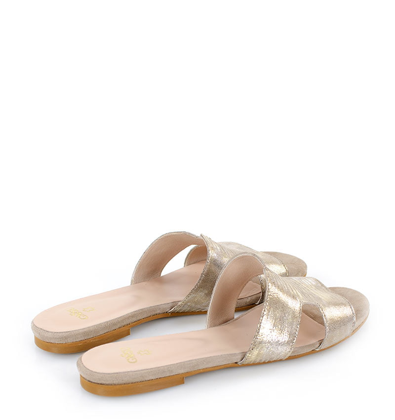 MELANIE – Złote klapki na płaskim obcasie. Czubek w migdałowy, wsuwane. Buty wykonane z naturalnej skóry licowej i zamszowej układającej się do stopy. Płaski obcas sprawia, że są to bardzo wygodne klapki. Tęgość butów: F 1/2. Wnętrze klapek wykończone skórą naturalną. Klapki na stopy z niskim podbiciem.