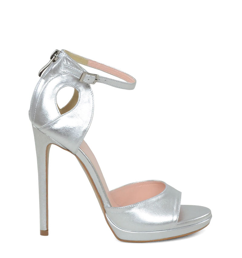 Srebrne sandałki na bardzo wysokim obcasie wykonywane są ręcznie, dzięki czemu istnieje możliwość indywidualnego dostosowania kolorów skór i wykończenia.