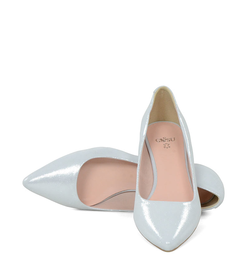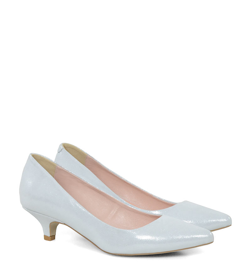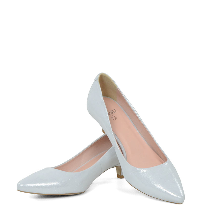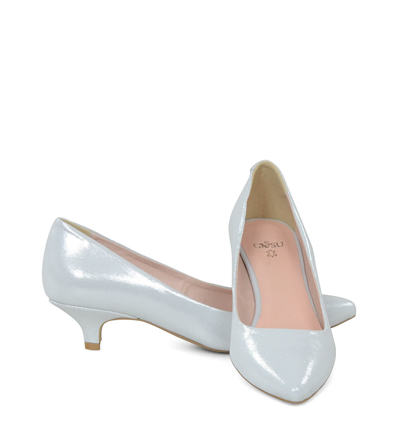 Jasno srebrne niskie szpilki wykonywane są ręcznie, dzięki czemu są dopracowane w każdym detalu. Ręczne wykonanie pozwala na dowolną zmianę koloru i rodzaju skóry na życzenie klienta.