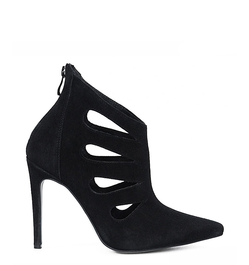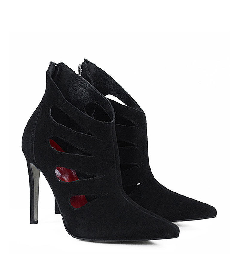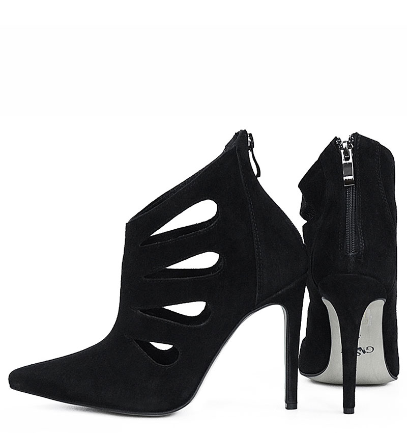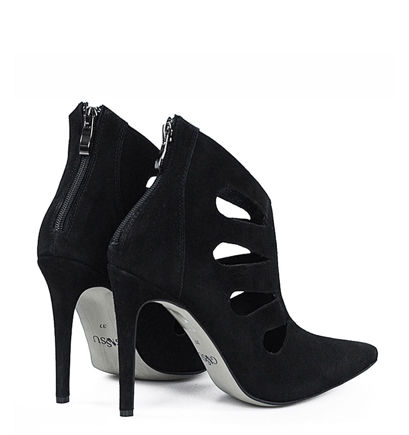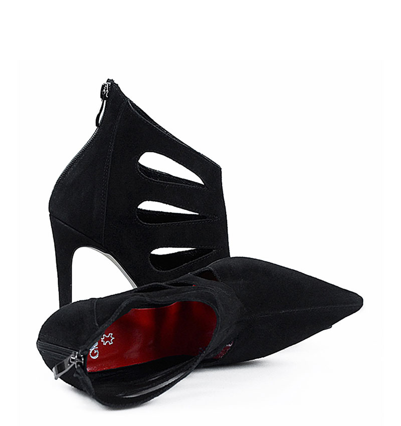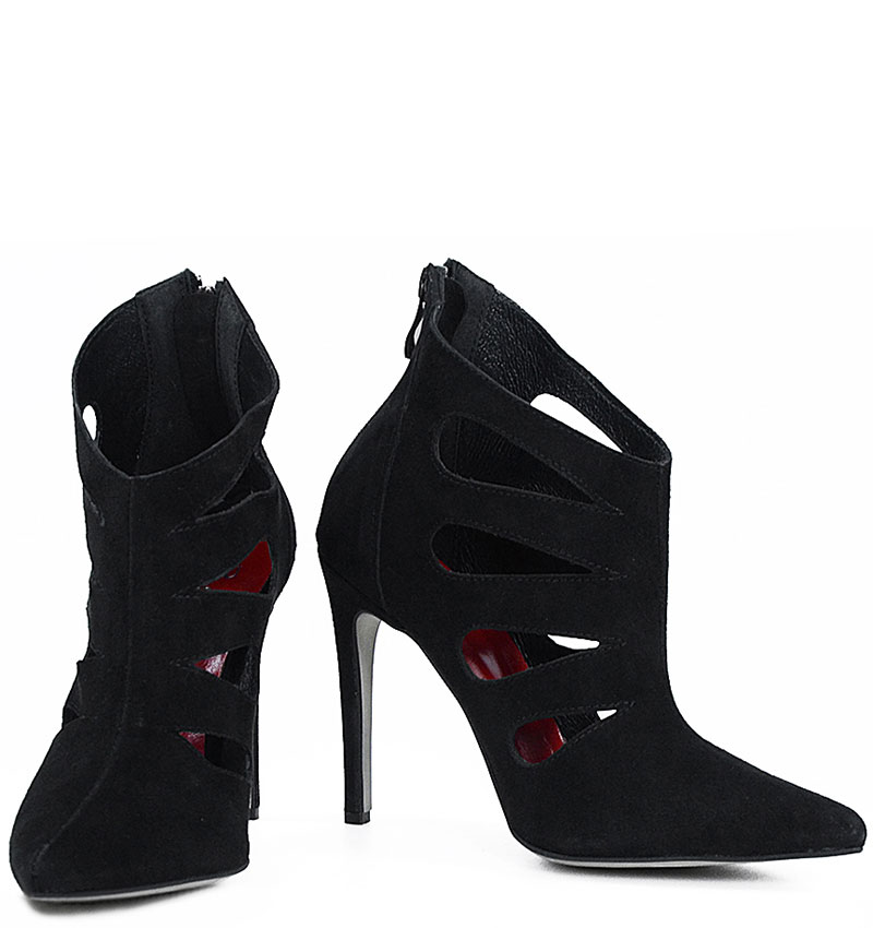 MIYU – Czarne botki szpilki, welurowe, ozdobne wycięcia
