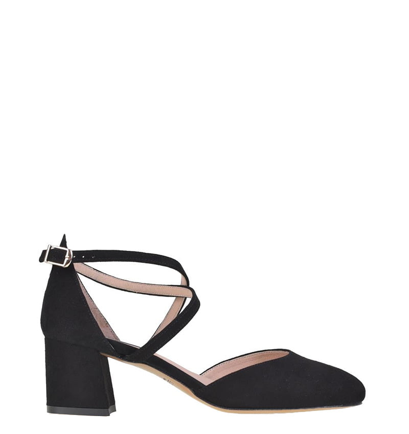MONICA – czarne czółenka na słupku. Buty mają zapinane na krzyż paseczki, które dobrze trzymają stopę. Nosek butów jest zaokrąglony. Całe obuwie wykonane jest z naturalnej skóry zamszowej, co zapewnia wysoką jakość i trwałość materiału.