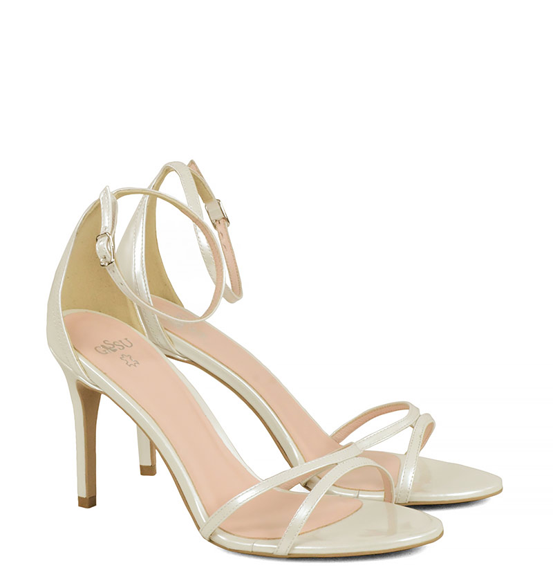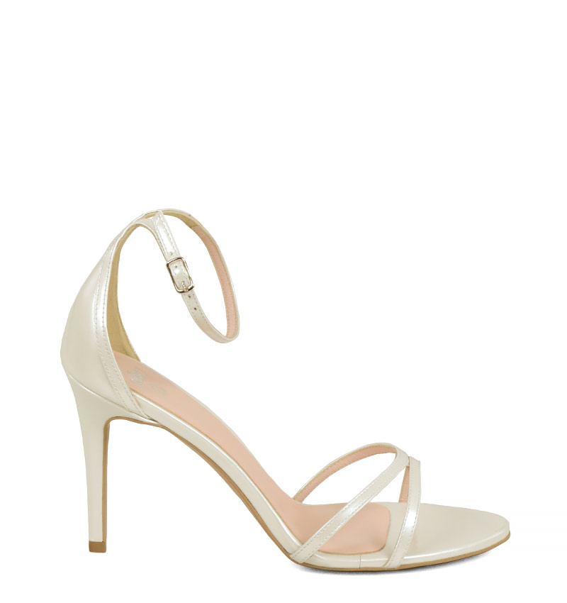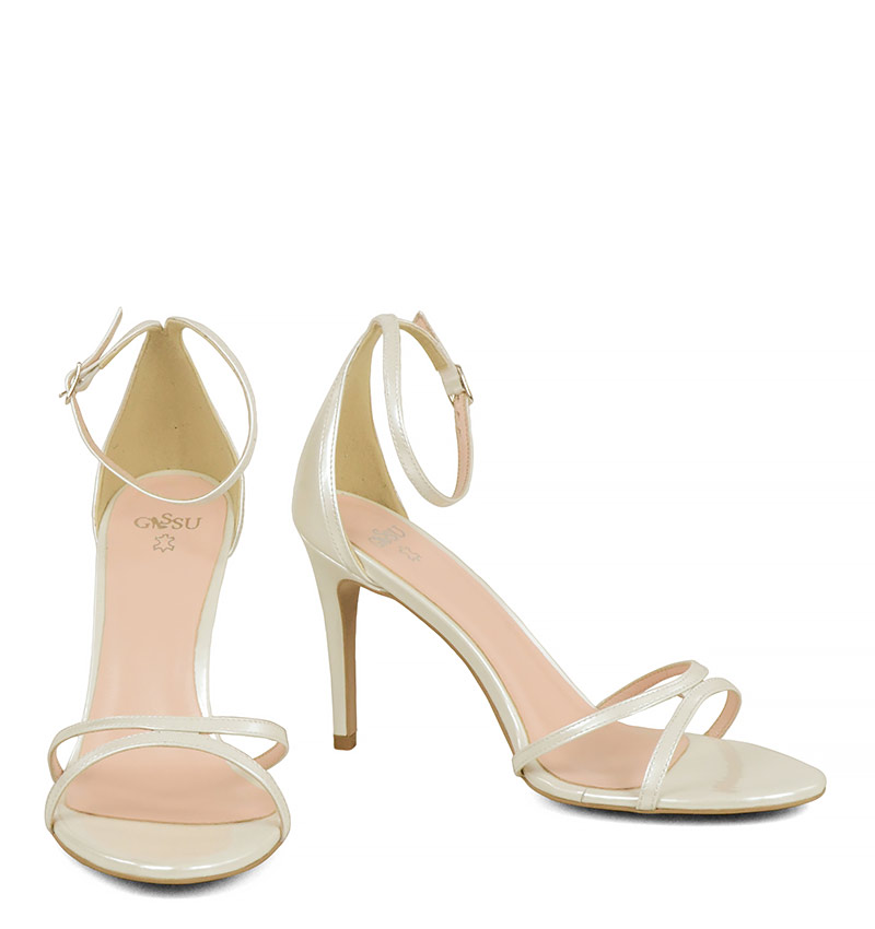 NARE – Ecru (kremowe) sandałki na szpilce, wykonane z naturalnej skóry lakierowanej. Obcas 9 cm (wysokość obcasa jest mierzona dla rozmiaru 37). Cholewka w postaci cienkich paseczków i mocniej wykrojona pięta, dodaje sandałkom delikatności. Tęgość butów to F 1/2. Wnętrze wykończone delikatną skórą naturalną. Ecru sandałki są elementem kolekcji butów bo ślubu.