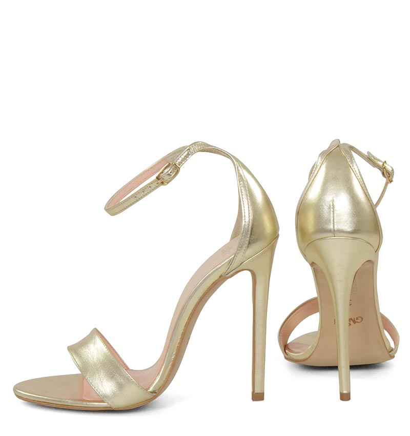 NATALIE – Złote wysokie sandałki na szpilce. Wysokość obcasa: 11,7 cm (wysokość obcasa jest mierzona w rozmiarze 37). Czarne sandałki na szpilce dzięki swojej wysokości wysmuklają stopę, podkreślając jej delikatność. Zakryta, nieco mocniej wykrojona pięta i pasek nad kostką dodatkowo optycznie wysmuklają sylwetkę buta. Sandałki są wykonane z złotej skóry licowej, która doskonale układa się do stopy. Buty przeznaczone dla Pań dobrze czujących się w ekstremalnie wysokich obcasach. Tęgość butów: F 1/2. Wnętrze butów i wkładka wykonane są ze skóry naturalnej.