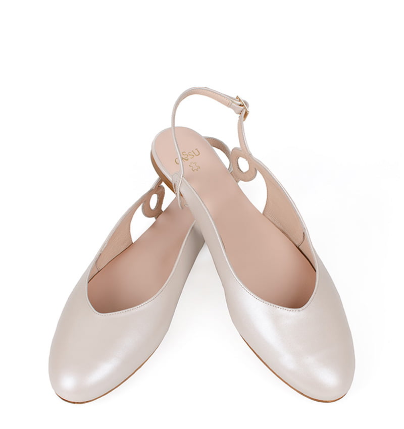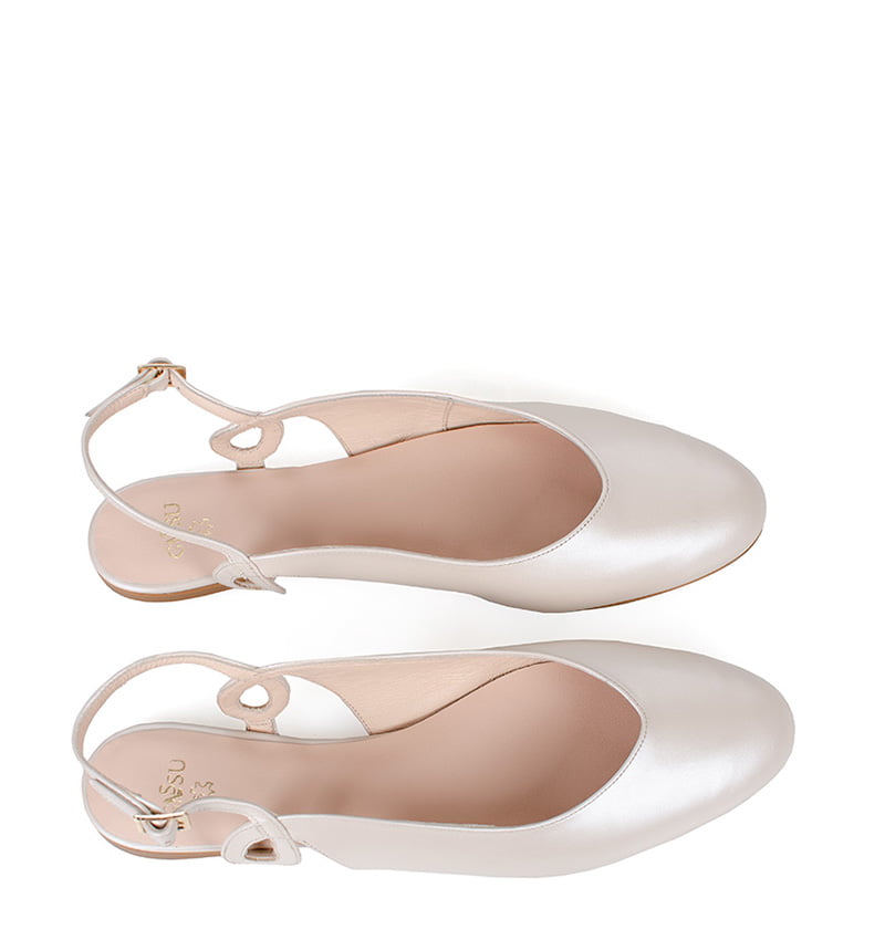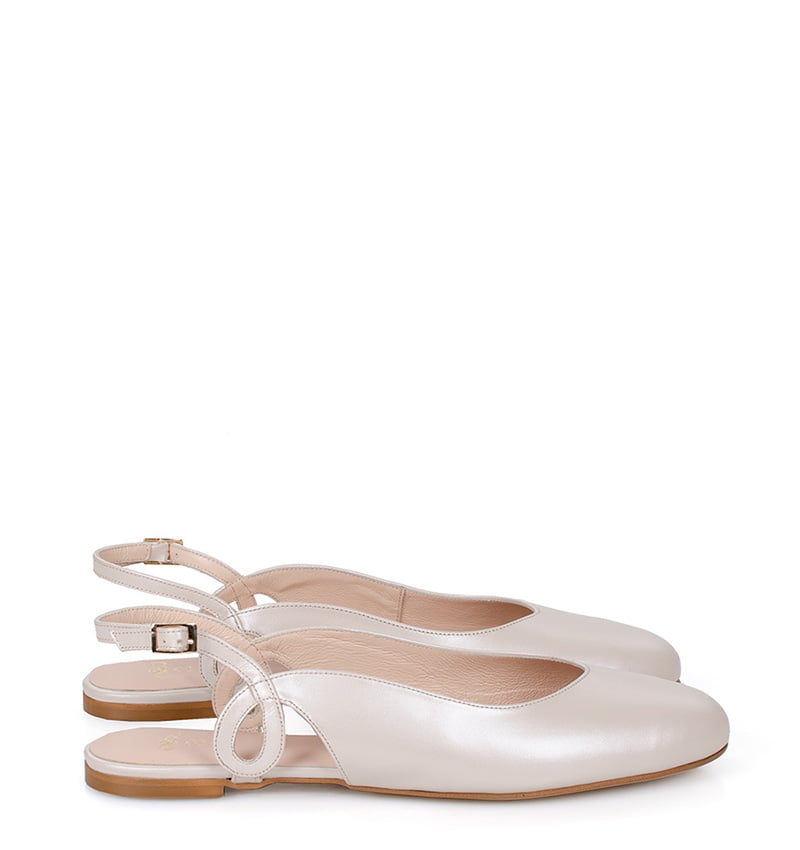 NELL – Beżowo perłowe baleriny z licowej skóry, z odkrytą pietą. Płaski obcas oraz zaokrąglony nosek. Wygodne letnie baleriny zapinane na klamerkę na pięcie. Buty wykonane z naturalnej beżowej skóry licowej z perłowym połyskiem. Tęgość butów to F 1/2. Beżowe baleriny z odkrytą piętą są bardzo wygodne i przewiewne, dzięki czemu zapewnią komfort w upalne dni.
