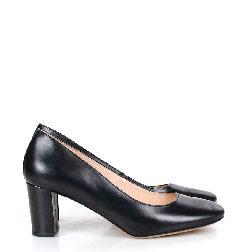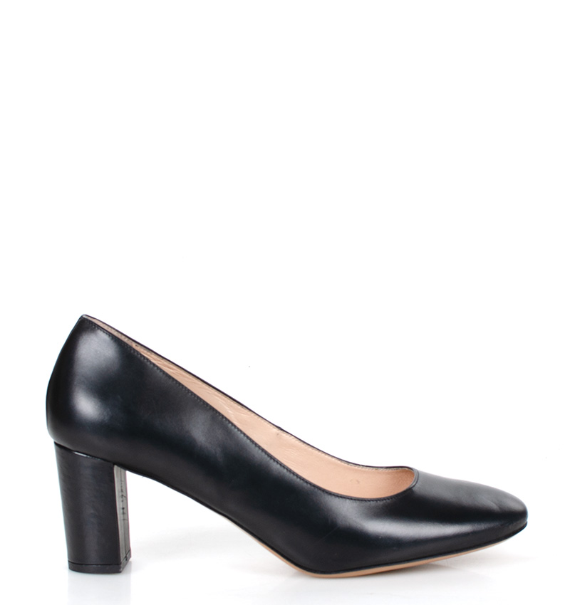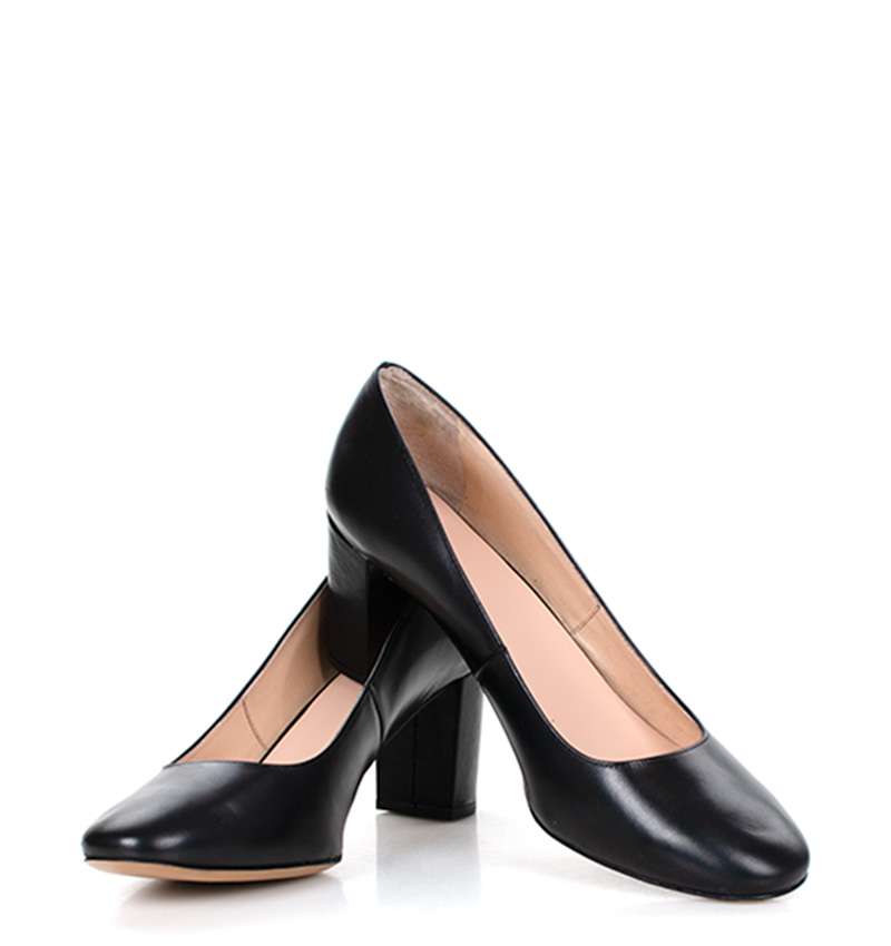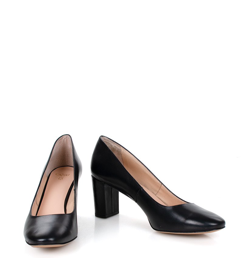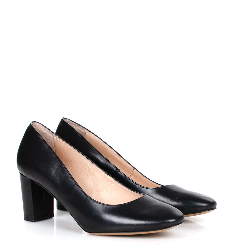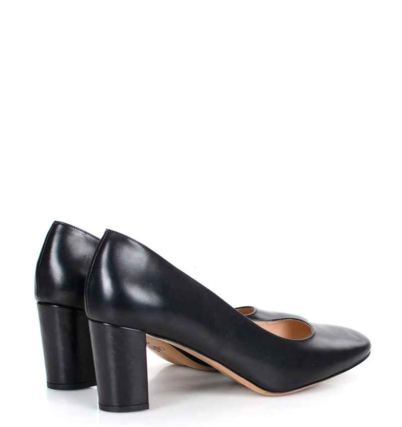 NORMA – Czarne czółenka na grubym słupku o wysokości 7,5 cm (wysokość obcasa jest mierzona w rozmiarze 37). Czubek okrągły. Buty wykonane z naturalnej skóry licowej. Wysokość i szerokość obcasa sprawia, że są to bardzo wygodne czółenka. Tęgość butów: F 1/2. Wnętrze butów i wkładka wykonane są ze skóry naturalnej.
