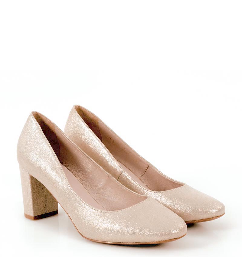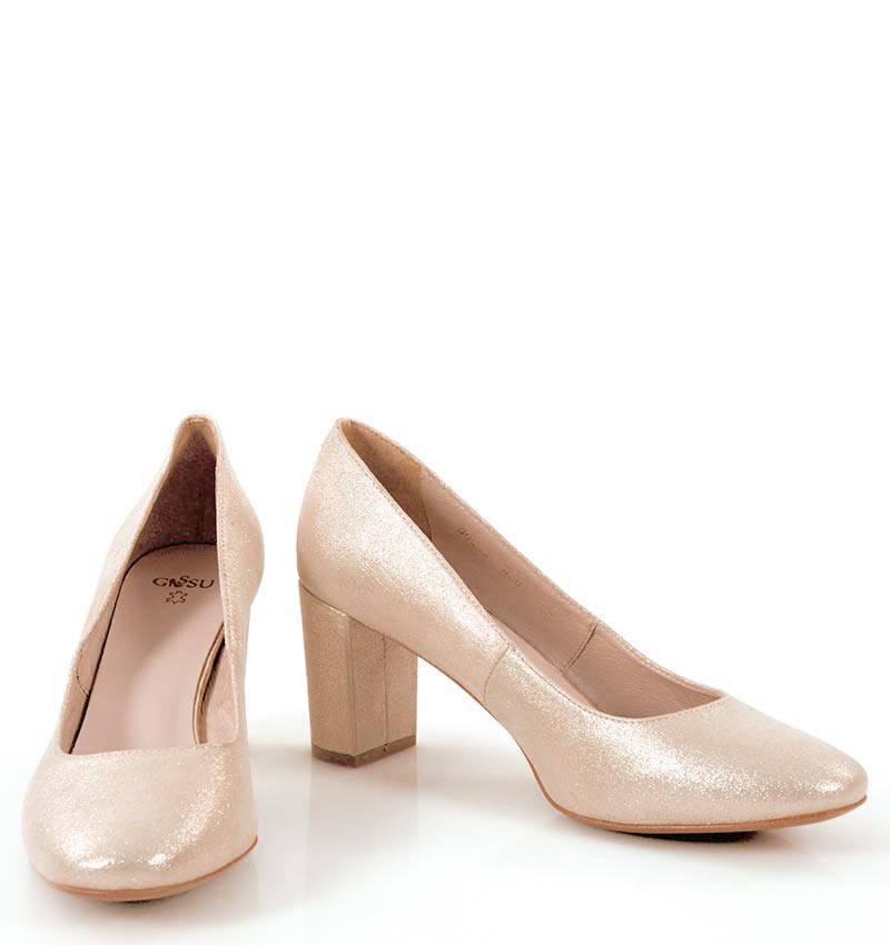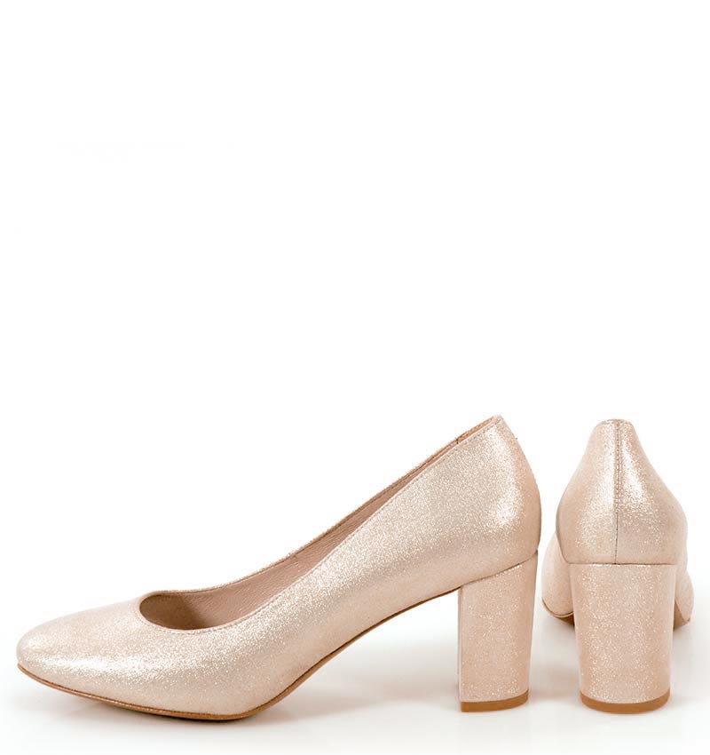 NORMA – Różowo-złote czółenka na grubym słupku na 7,5 cm obcasie (wysokość obcasa jest mierzona w rozmiarze 37). Czubek w migdałowy. Buty wykonane z naturalnej skóry satynowanej układającej się do stopy. Średnia wysokość obcasa sprawia, że są to wygodne czółenka na szpilce. Tęgość butów: F 1/2. Wnętrze butów i wkładka wykonane są ze skóry naturalnej.