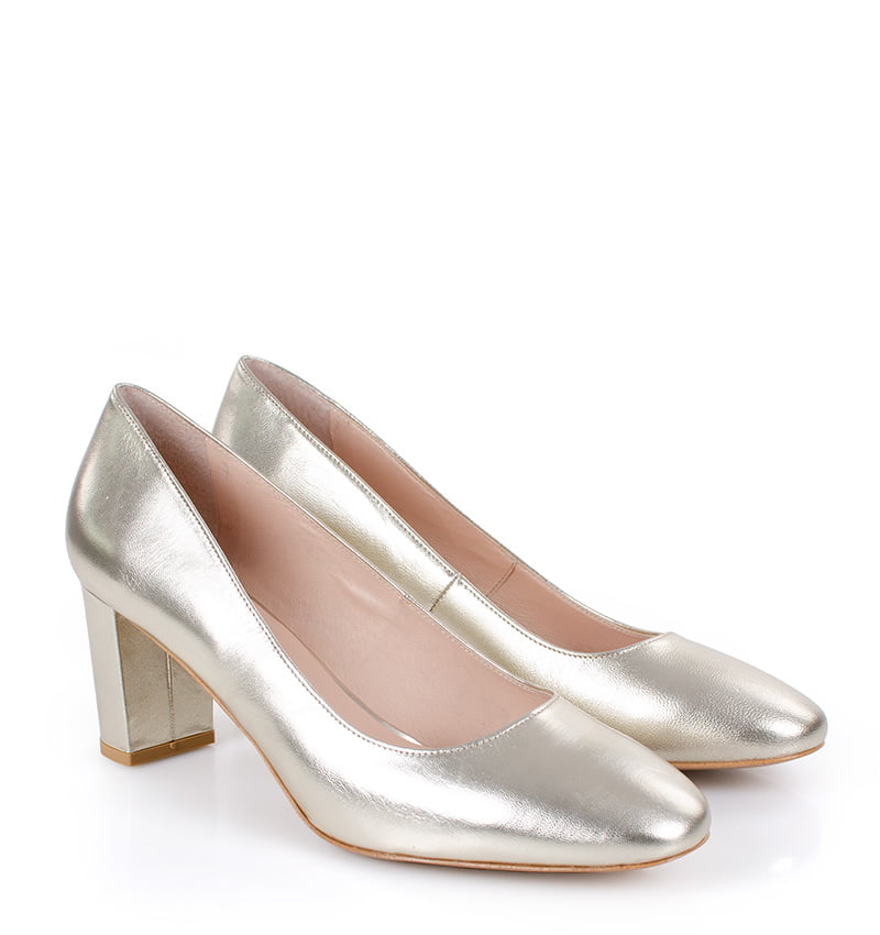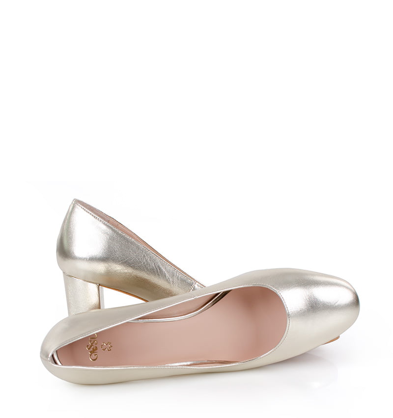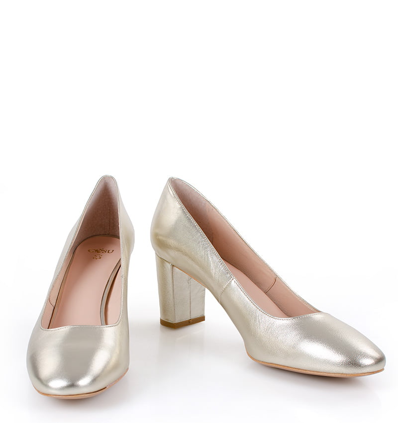 NORMA – Złote czółenka na grubym słupku o wysokości 7,5 cm (wysokość obcasa jest mierzona w rozmiarze 37). Czubek okrągły. Buty wykonane z naturalnej skóry licowej. Wysokość i szerokość obcasa sprawia, że są to bardzo wygodne czółenka. Tęgość butów: F 1/2. Wnętrze butów i wkładka wykonane są ze skóry naturalnej.