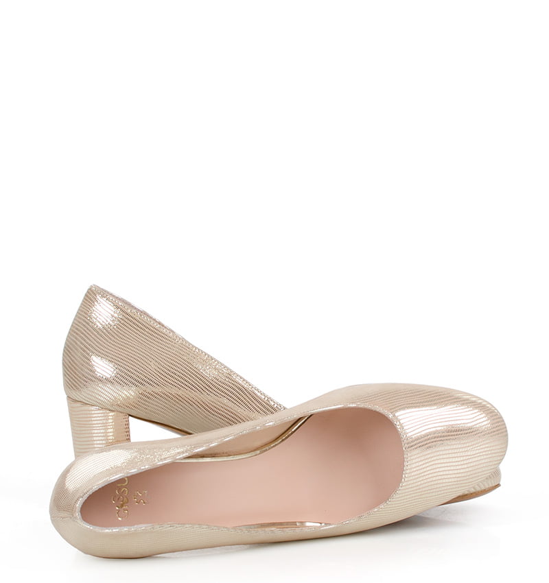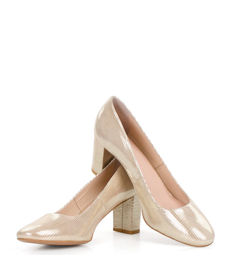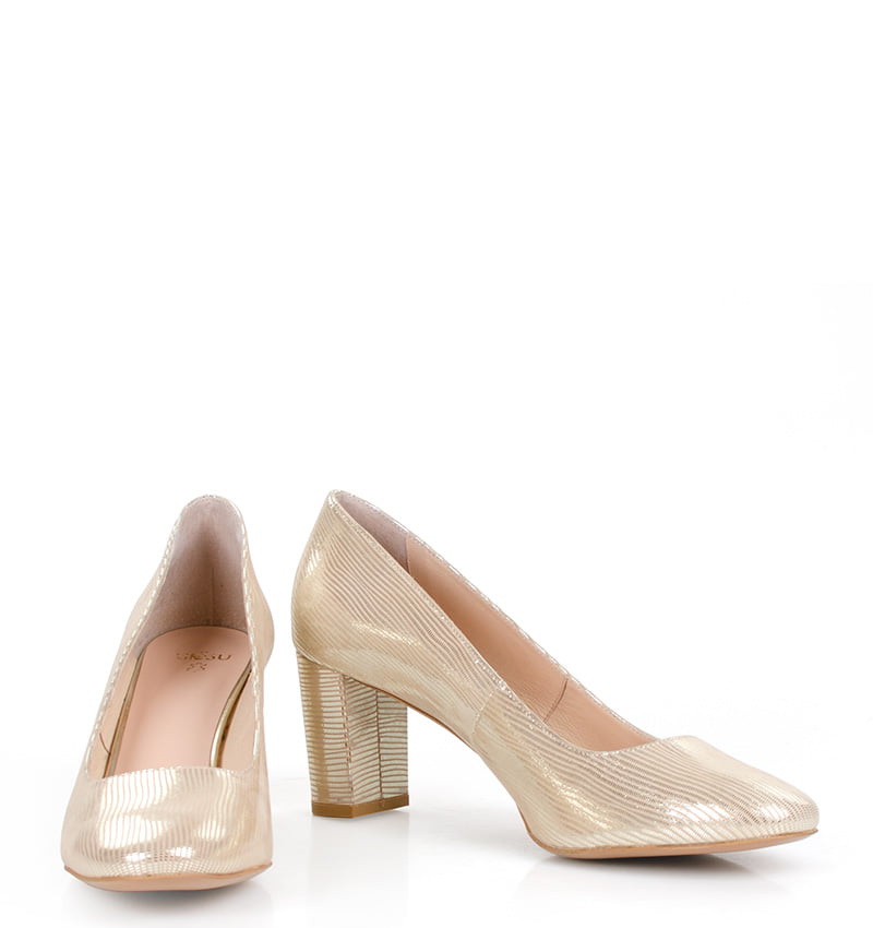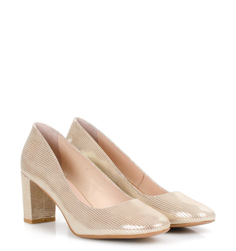 NORMA – Wyjątkowe, złote czółenka wykonane z naturalnej skóry z delikatnym wzorem. Buty na słupku o wysokości 7,5 cm (wysokość obcasa jest mierzona w rozmiarze 37). Wysokość i szerokość obcasa sprawia, że są to bardzo wygodne czółenka. Tęgość butów: F 1/2. Wnętrze butów i wkładka wykonane są ze skóry naturalnej.