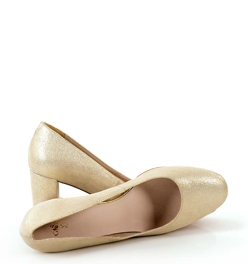 NORMA – Złote czółenka na grubym słupku na 7,5 cm obcasie (wysokość obcasa jest mierzona w rozmiarze 37). Czubek w migdałowy. Buty wykonane z naturalnej skóry satynowanej układającej się do stopy. Średnia wysokość obcasa sprawia, że są to wygodne czółenka na szpilce. Tęgość butów: F 1/2. Wnętrze butów i wkładka wykonane są ze skóry naturalnej.