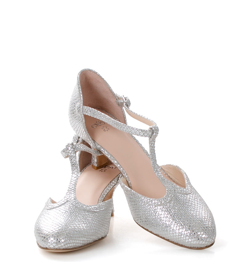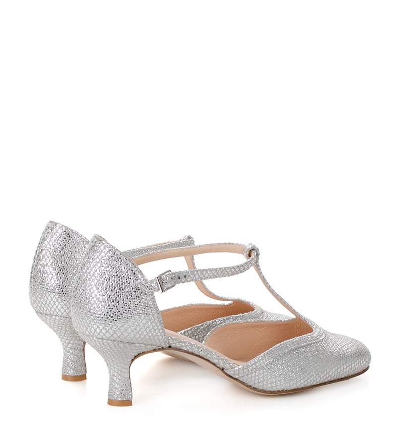 OLIVIA – Eleganckie, srebrne czółenka z uroczym paskiem t-strap, tworzące perfekcyjny wybór dla miłośniczek tańca i nie tylko. Ten model zachwyca nie tylko swoim wyglądem, ale także funkcjonalnością. Z niskim obcasem, osiągającym wysokość 5,5 cm (dla rozmiaru 37), zapewniają stabilność i komfort na parkiecie.