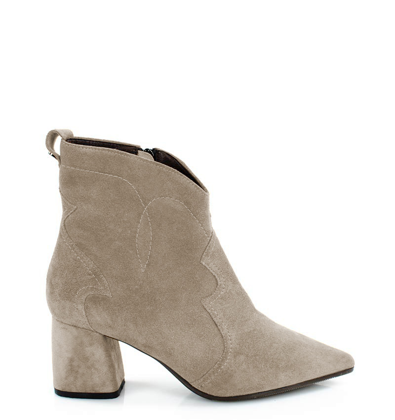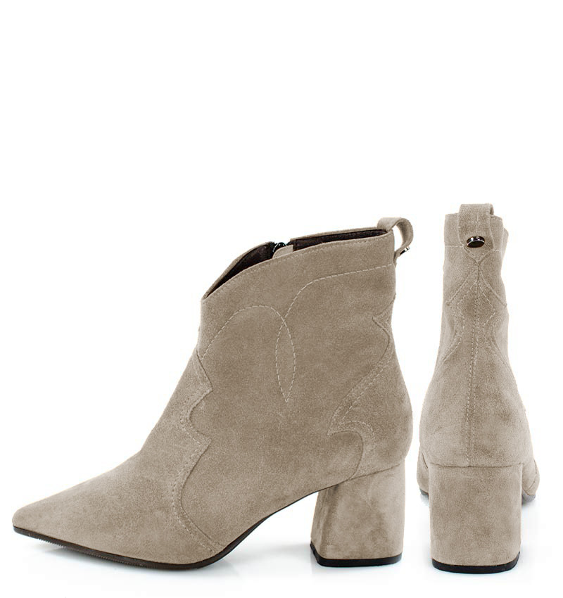 PEGGY – Beżowe botki na stabilnym 6,5 cm słupku (wysokość obcasa jest mierzona w rozmiarze 37). Cholewka za kostkę wykonana z welurowej skóry naturalnej, ozdobiona motywem klasycznych kowbojek. Nosek w szpic wysmukla sylwetkę buta. Zapinane na zamek, dzięki czemu są wygodne w zakładaniu. Botki nie ocieplone, dzięki czemu będą idealne na ciepłe jesienno-zimowe dni. Czubek w migdałowy. Tęgość butów: F 1/2. Wnętrze butów i wkładka wykonane są ze skóry naturalnej.