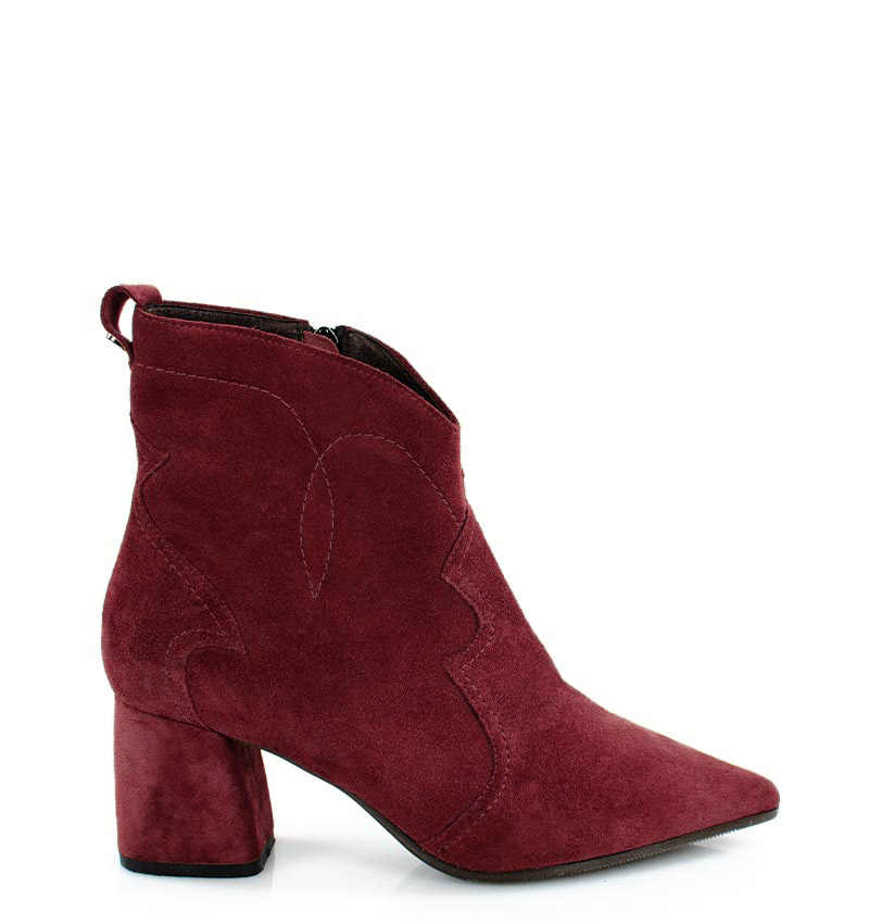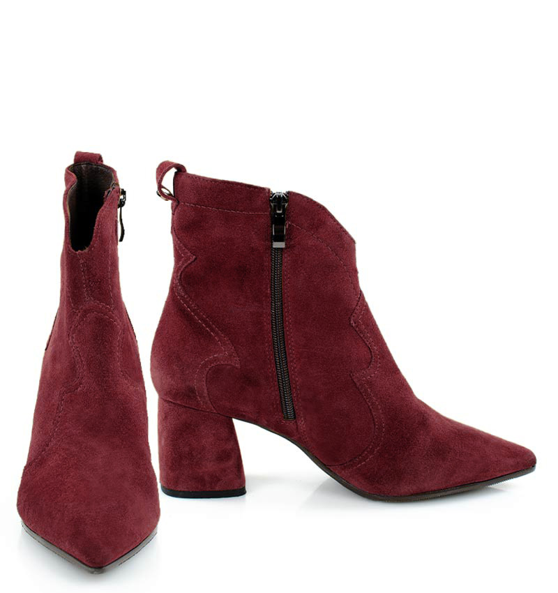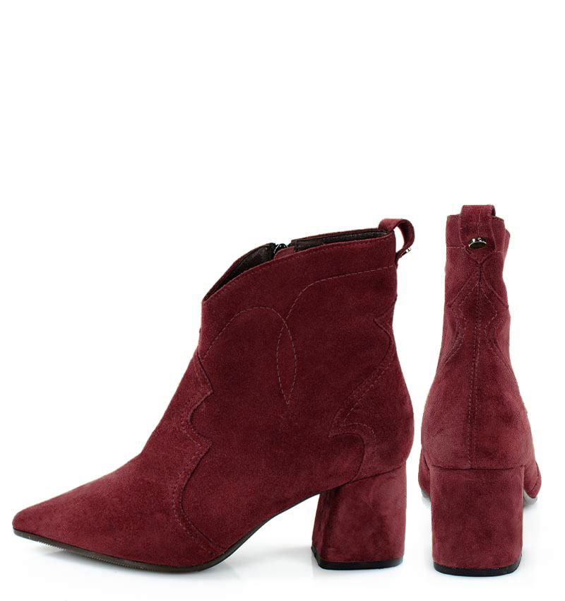 PEGGY – Bordowe botki na stabilnym 6,5 cm słupku (wysokość obcasa jest mierzona w rozmiarze 37). Cholewka za kostkę wykonana z zamszowej skóry naturalnej, ozdobiona motywem klasycznych kowbojek. Nosek w szpic wysmukla sylwetkę buta. Zapinane na zamek, dzięki czemu są wygodne w zakładaniu. Botki nie ocieplone, dzięki czemu będą idealne na ciepłe jesienno-zimowe dni. Czubek w migdałowy. Tęgość butów: F 1/2. Wnętrze butów i wkładka wykonane są ze skóry naturalnej.