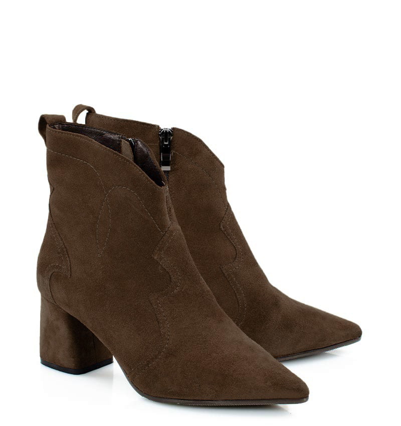 PEGGY – Ciemno brązowe botki na stabilnym 6,5 cm słupku (wysokość obcasa jest mierzona w rozmiarze 37). Cholewka za kostkę wykonana z welurowej skóry naturalnej, ozdobiona motywem klasycznych kowbojek. Nosek w szpic wysmukla sylwetkę buta. Zapinane na zamek, dzięki czemu są wygodne w zakładaniu. Botki nie ocieplone, dzięki czemu będą idealne na ciepłe jesienno-zimowe dni. Czubek w migdałowy. Tęgość butów: F 1/2. Wnętrze butów i wkładka wykonane są ze skóry naturalnej.