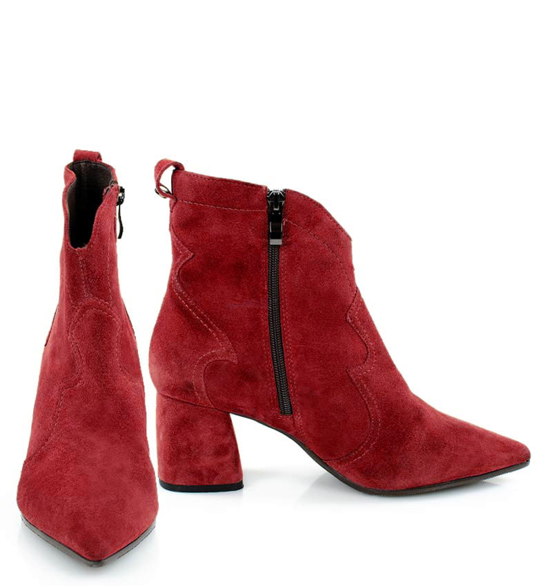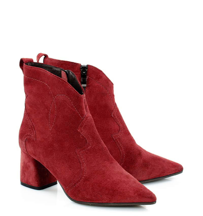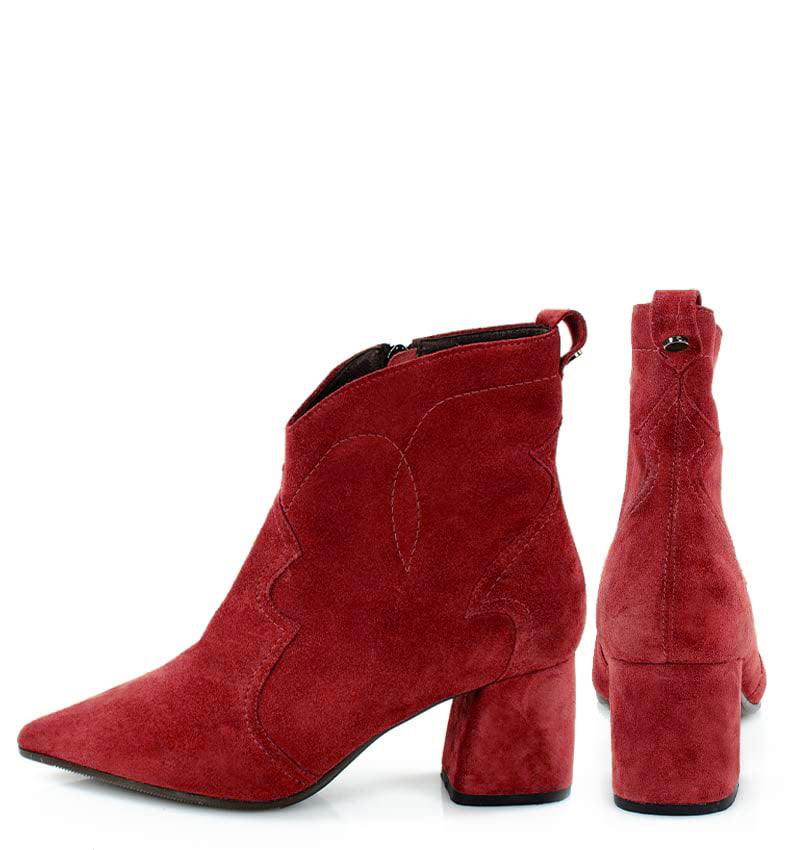PEGGY – Czerwone botki na stabilnym 6,5 cm słupku (wysokość obcasa jest mierzona w rozmiarze 37). Cholewka za kostkę wykonana z zamszowej skóry naturalnej, ozdobiona motywem klasycznych kowbojek. Nosek w szpic wysmukla sylwetkę buta. Zapinane na zamek, dzięki czemu są wygodne w zakładaniu. Botki nie ocieplone, dzięki czemu będą idealne na ciepłe jesienno-zimowe dni. Czubek w migdałowy. Tęgość butów: F1/2. Wnętrze butów i wkładka wykonane są ze skóry naturalnej.