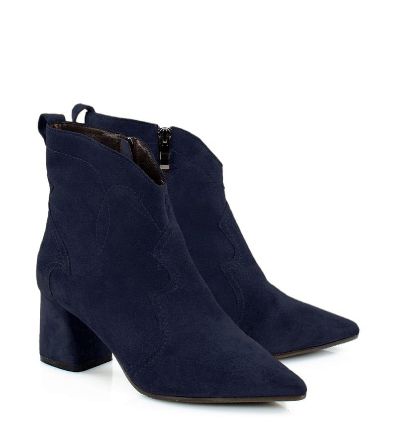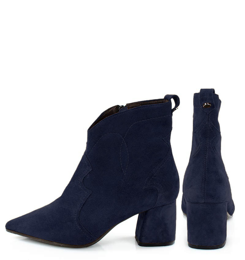 PEGGY – Granatowe botki na stabilnym 6,5 cm słupku (wysokość obcasa jest mierzona w rozmiarze 37). Cholewka za kostkę wykonana z zamszowej skóry naturalnej, ozdobiona motywem klasycznych kowbojek. Nosek w szpic wysmukla sylwetkę buta. Zapinane na zamek, dzięki czemu są wygodne w zakładaniu. Botki nie ocieplone, dzięki czemu będą idealne na ciepłe jesienno-zimowe dni. Czubek w migdałowy. Tęgość butów: F 1/2. Wnętrze butów i wkładka wykonane są ze skóry naturalnej.