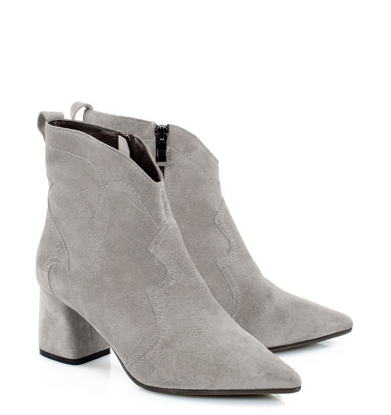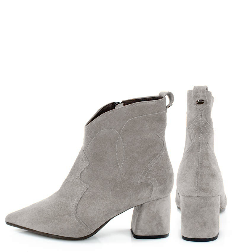 PEGGY – Jasno szare botki na stabilnym 6,5 cm słupku (wysokość obcasa jest mierzona w rozmiarze 37). Cholewka za kostkę wykonana z zamszowej skóry naturalnej, ozdobiona motywem klasycznych kowbojek. Nosek w szpic wysmukla sylwetkę buta. Zapinane na zamek, dzięki czemu są wygodne w zakładaniu. Botki nie ocieplone, dzięki czemu będą idealne na ciepłe jesienno-zimowe dni. Czubek w migdałowy. Tęgość butów: F 1/2. Wnętrze butów i wkładka wykonane są ze skóry naturalnej.