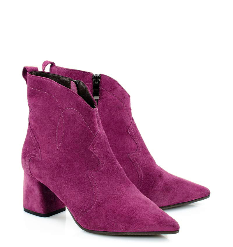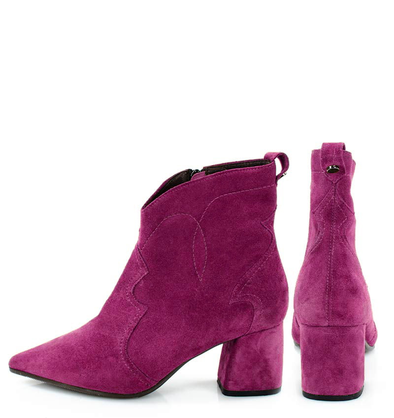 PEGGY – Różowe botki na stabilnym 6,5 cm słupku (wysokość obcasa jest mierzona w rozmiarze 37). Cholewka za kostkę wykonana z welurowej skóry naturalnej, ozdobiona motywem klasycznych kowbojek. Nosek w szpic wysmukla sylwetkę buta. Zapinane na zamek, dzięki czemu są wygodne w zakładaniu. Botki nie ocieplone, dzięki czemu będą idealne na ciepłe jesienno-zimowe dni. Czubek w migdałowy. Tęgość butów: F 1/2. Wnętrze butów i wkładka wykonane są ze skóry naturalnej.