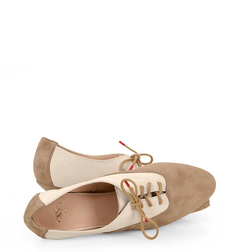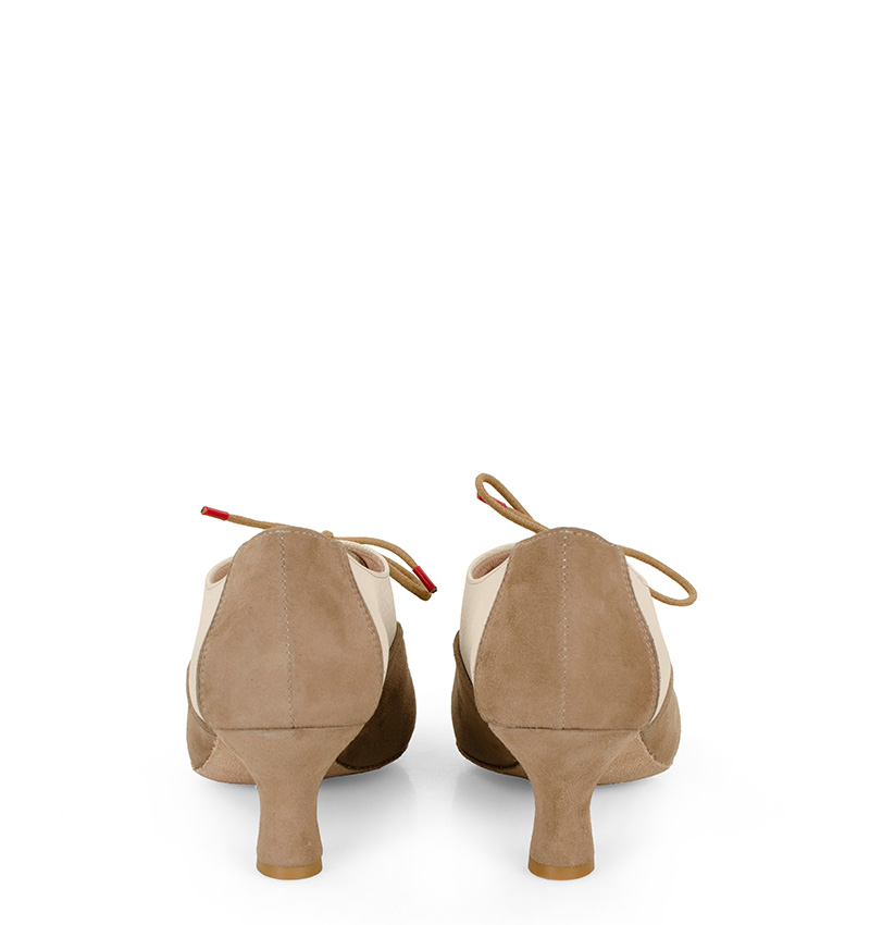 PILAR – Beżowe buty treningowe na 5,5 cm obcasie (wysokość obcasa jest mierzona dla rozmiaru 37) z beżową lamówką. Buty dedykowane do ćwiczeń tanga i tańców towarzyskich. Podeszwa skórzana welurowa, dzięki czemu jest elastyczna i miękka. PILAR to wygodne buty sznurowane do ćwiczeń oraz do tańca klasycznego. Buty dobrze wyglądają do spódnico-spodni. Ze względu na welurową podeszwę, buty te nie nadają się do chodzenia po chodniku i są przeznaczone wyłącznie na parkiet.