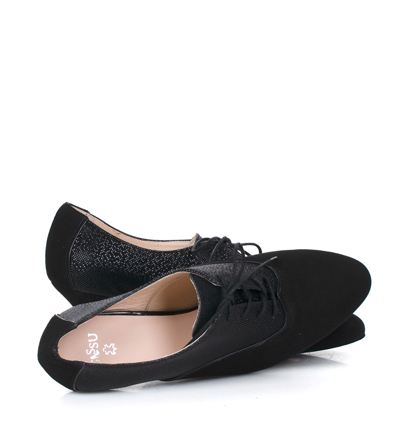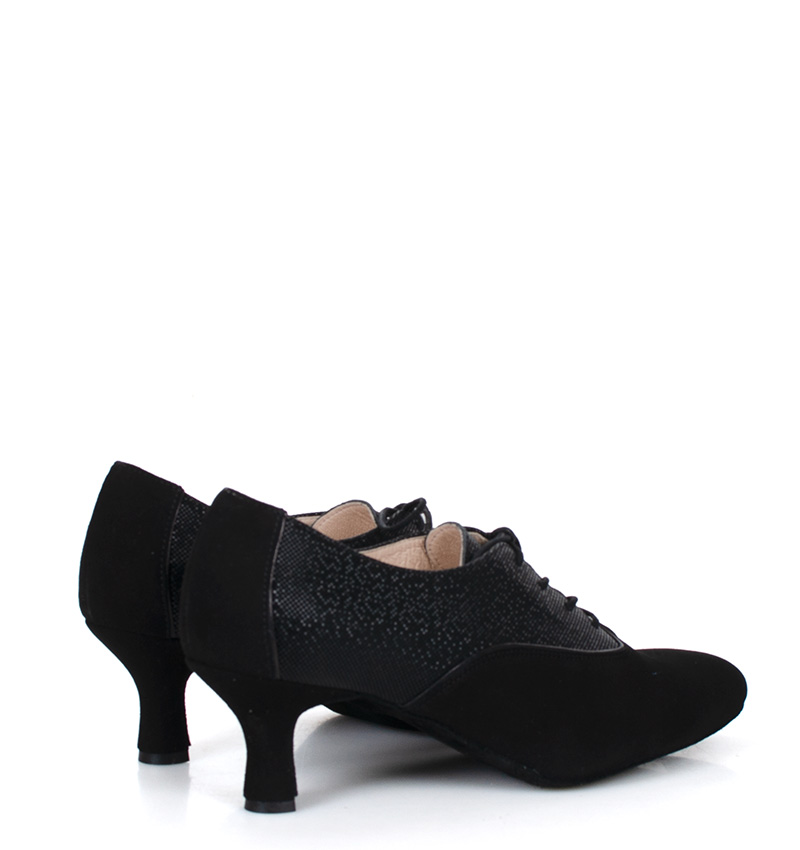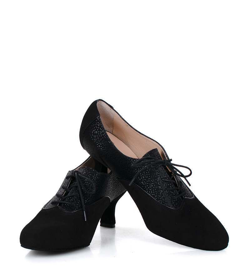 PILAR  Czarne buty treningowe na 5,5 cm obcasie (wysokość obcasa jest mierzona dla rozmiaru 37) z czarną lamówką i błyszczącą wstawką. Buty dedykowane do ćwiczeń tanga i tańców towarzyskich. Podeszwa skórzana welurowa, dzięki czemu jest elastyczna i miękka. PILAR to wygodne buty sznurowane do ćwiczeń oraz do tańca klasycznego. Buty dobrze wyglądają do spódnico-spodni. Ze względu na welurową podeszwę, buty te nie nadają się do chodzenia po chodniku i są przeznaczone wyłącznie na parkiet.