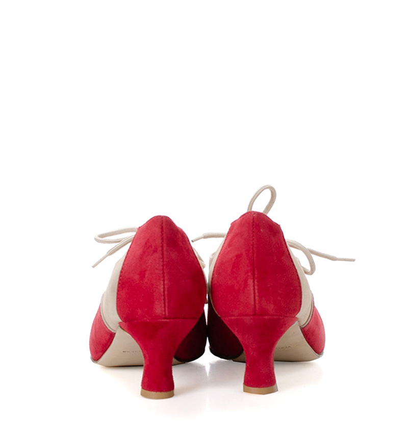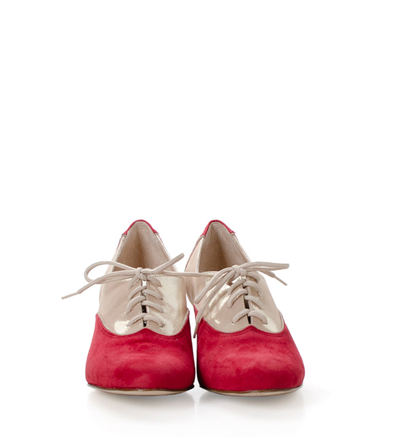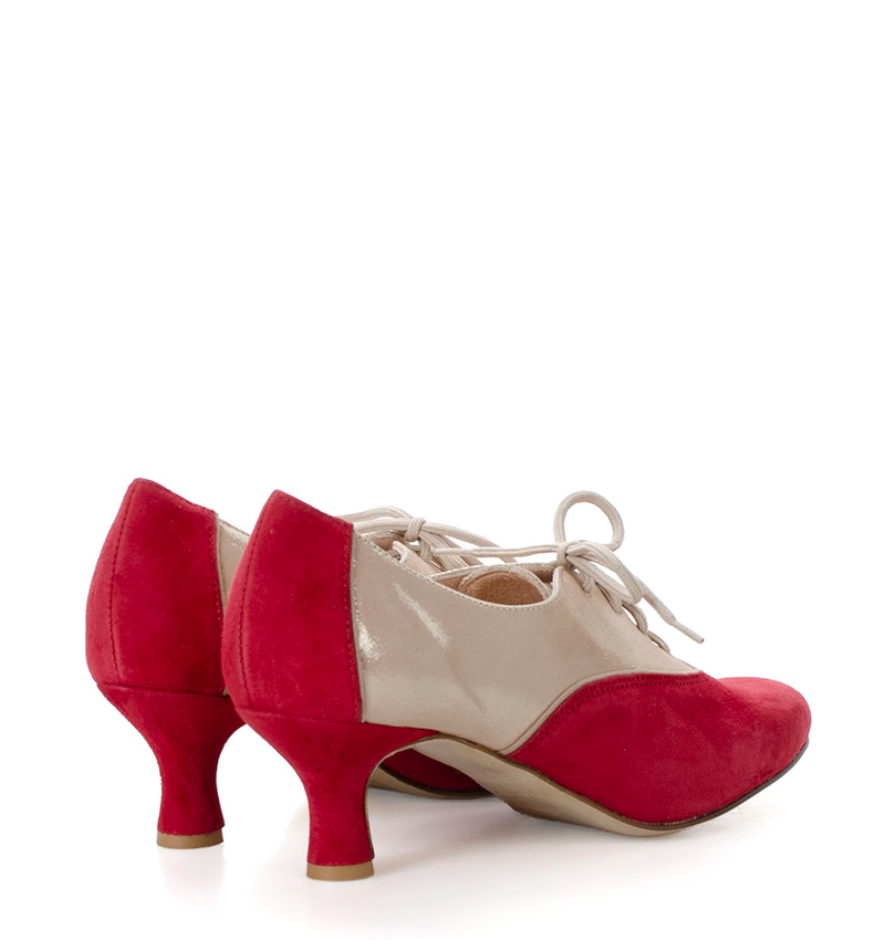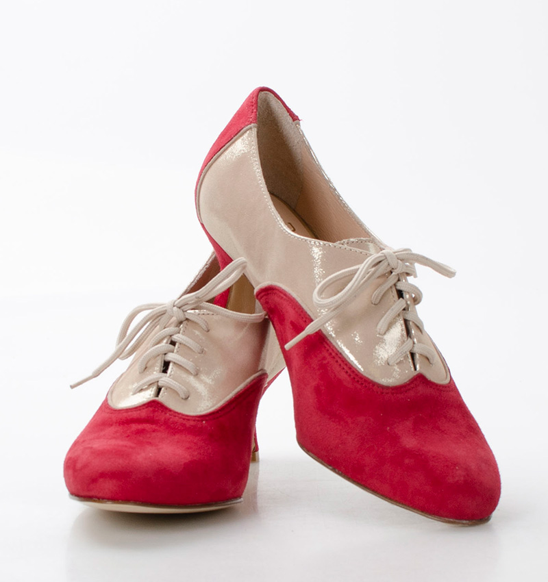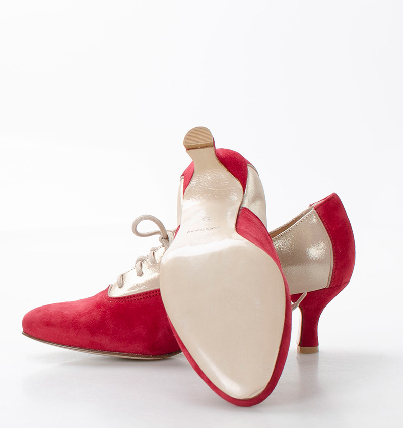 PILAR  Czerwono złote buty treningowe na 5,5 cm obcasie (wysokość obcasa jest mierzona dla rozmiaru 37) z beżową lamówką. Buty dedykowane do ćwiczeń tanga i tańców towarzyskich. Podeszwa skórzana licowa, dzięki czemu jest elastyczna i miękka. PILAR to wygodne buty sznurowane do ćwiczeń oraz do tańca klasycznego. Buty dobrze wyglądają do spódnico-spodni.