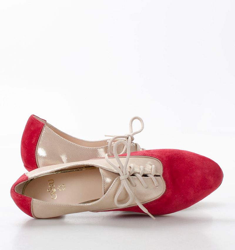 – Cholewka: czerwony zamsz, złote kropki